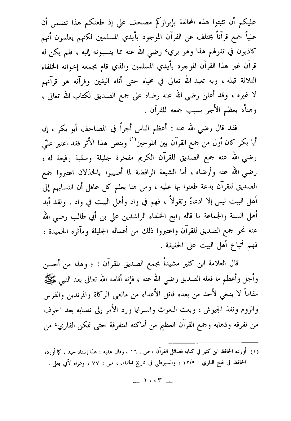 فقد قال رضي الله عنه: أعظم الناس أجراً في المصاحف أبو بكر، إن أبا بكر كان أول من جمع القرآن بين اللوحين1 وبنص هذا الأثر فقد اعتبر علي رضي الله عنه جمع الصديق للقرآن الكريم مفخرة جليلة ومنقبة رفيعة له، رضي الله عنه وأرضاه، أما الشيعة الرافضة لما أصيبوا بالخذلان اعتبروا جمع الصديق للقرآن بدعة طعنوا بها عليه، ومن هنا يعلم كل عاقل أن انتسابهم إلى أهل البيت ليس إلا ادعاءً وتقولاً، فهم في واد وأهل البيت في واد، ولقد أيد أهل السنة والجماعة ما قاله رابع الخلفاء الراشدين علي بن أبي طالب رضي الله عنه نحو جمع الصديق للقرآن واعتبروا ذلك من أعماله الجليلة ومآثره الحميدة، فهم أتباع أهل البيت على الحقيقة.