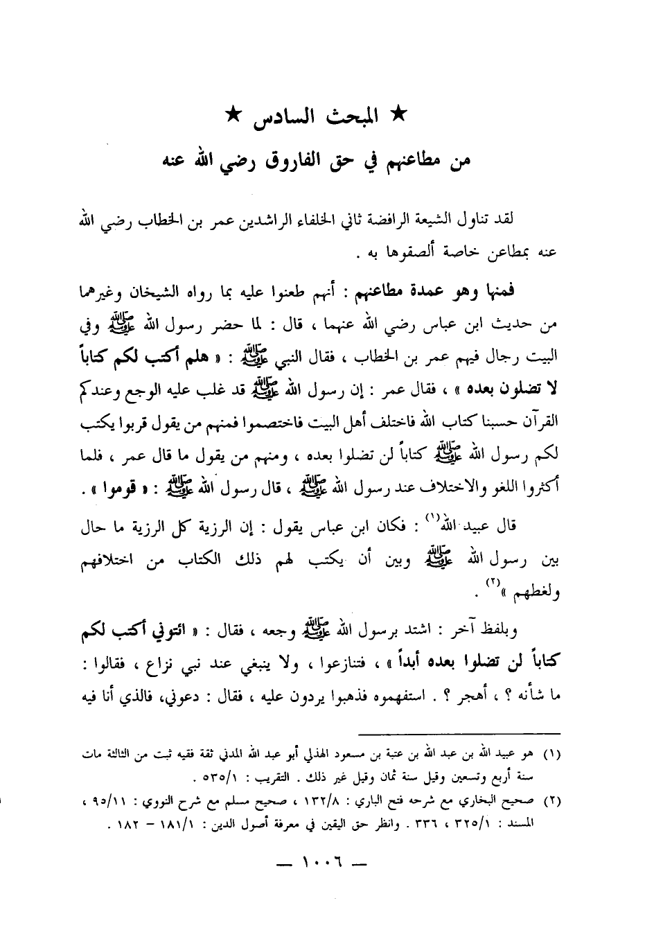 فمنها وهو عمدة مطاعنهم: أنهم طعنوا عليه بما رواه الشيخان وغيرهما من حديث ابن عباس رضي الله عنهما، قال: لما حضر رسول الله صلى الله عليه وسلم وفي البيت رجال فيهم عمربن الخطاب، فقال النبي صلى الله عليه وسلم: "هلم أكتب لكم كتاباً لا تضلون بعده"، فقال عمر: إن رسول الله صلى الله عليه وسلم قد غلب عليه الوجع وعندكم القرآن حسبنا كتاب الله فاختلف أهل البيت فاختصموا فمنهم من يقول قربوا يكتب لكم رسول الله صلى الله عليه وسلم كتاباً لن تضلوا بعده، ومنهم من يقول ما قال عمر، فلما أكثروا اللغو والاختلاف عند رسول الله صلى الله عليه وسلم، قال رسول الله صلى الله عليه وسلم: "قوموا".