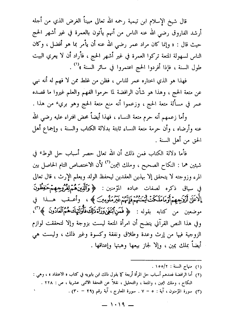 فهذه هو الذي اختاره عمر للناس، فظن من غلط ممن لا فهم له أنه نهى عن متعة الحج، وهذا هو شأن الرافضة لما حرموا الفهم والعلم غيروا ما قصده عمر في مسألة متعة الحج، وزعموا أنه منع متعة الحج وهو بريء من هذا.