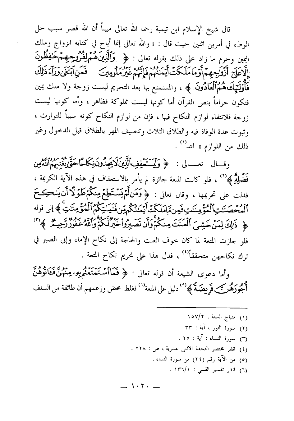 قال شيخ الإسلام ابن تيمية رحمه الله تعالى مبيناً أن الله قصر سبب حل الوطء في أمرين اثنين حيث قال: "والله تعالى إنما أباح الزواج وملك اليمين وحرم ما زاد على ذلك بقوله تعالى: {وَالَّذِينَ هُمْ لِفُرُوجِهِمْ حَافِظُونَ * إِلاَّ عَلَى أَزْوَاجِهِمْ أَوْ مَا مَلَكَتْ أَيْمَانُهُمْ فَإِنَّهُمْ غَيْرُ مَلُومِينَ * فَمَنِ ابْتَغَى وَرَاءَ ذَلِكَ فَأُولَئِكَ هُمُ الْعَادُونَ} ، والمستمتع بها بعد التحريم ليست زوجة ولا ملك يمين فتكون حراماً بنص القرآن أما كونها ليست مملوكة فظاهر، وأما كونها ليست زوجة فلانتفاء لوازم النكاح فيها، فإن من لوازم النكاح كونه سبباً للتوارث، وثبوت عدة الوفاة فيه والطلاق الثلاث وتنصيف المهر بالطلاق قبل الدخول وغير ذلك من اللوازم"أهـ1.