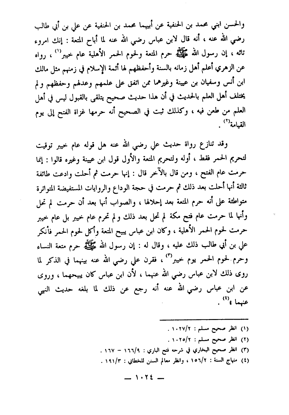 والحسن ابني محمد بن الحنفية عن أبيهما محمد بن الحنفية عن علي بن أبي طالب رضي الله عنه، أنه قال لابن عباس رضي الله عنه لما أباح المتعة: إنك امروء تائه، إن رسول الله صلى الله عليه وسلم حرم المتعة ولحوم الحمر الأهلية عام خيبر1، رواه عن الزهري أعلم أهل زمانه بالسنة وأحفظهم لها أئمة الإسلام في زمنهم مثل مالك بن أنس وسفيان بن عيينة وغيرهما ممن اتفق على علمهم وعدلهم وحفظهم ولم يختلف أهل العلم بالحديث في أن هذا حديث صحيح يتلقى بالقبول ليس في أهل العلم من طعن فيه، وكذلك ثبت في الصحيح أنه حرمها غزاة الفتح إلى يوم القيامة2.