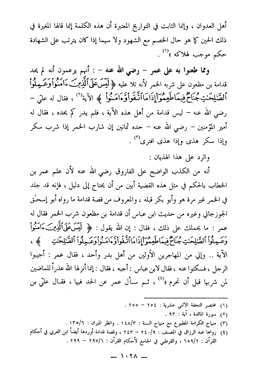 ومما طعنوا به على عمر رضي الله عنه: أنهم يزعمون أنه لم يحد قدامة بن مظعون على شربه الخمر لأنه تلا عليه {لَيْسَ عَلَى الَّذِينَ آمَنُوا وَعَمِلُوا الصَّالِحَاتِ جُنَاحٌ فِيمَا طَعِمُوا إِذَا مَا اتَّقَوْا وَآمَنُوا} الآية2، فقال له علي رضي الله عنه: ليس قدامة من أهل هذه الآية، فلم يدر كم يحده، فقال له أمير المؤمنين رضي الله عنه حده ثمانين إن شارب الخمر إذا شرب سكر وإذا سكر هذى وإذا هذى افترى3.