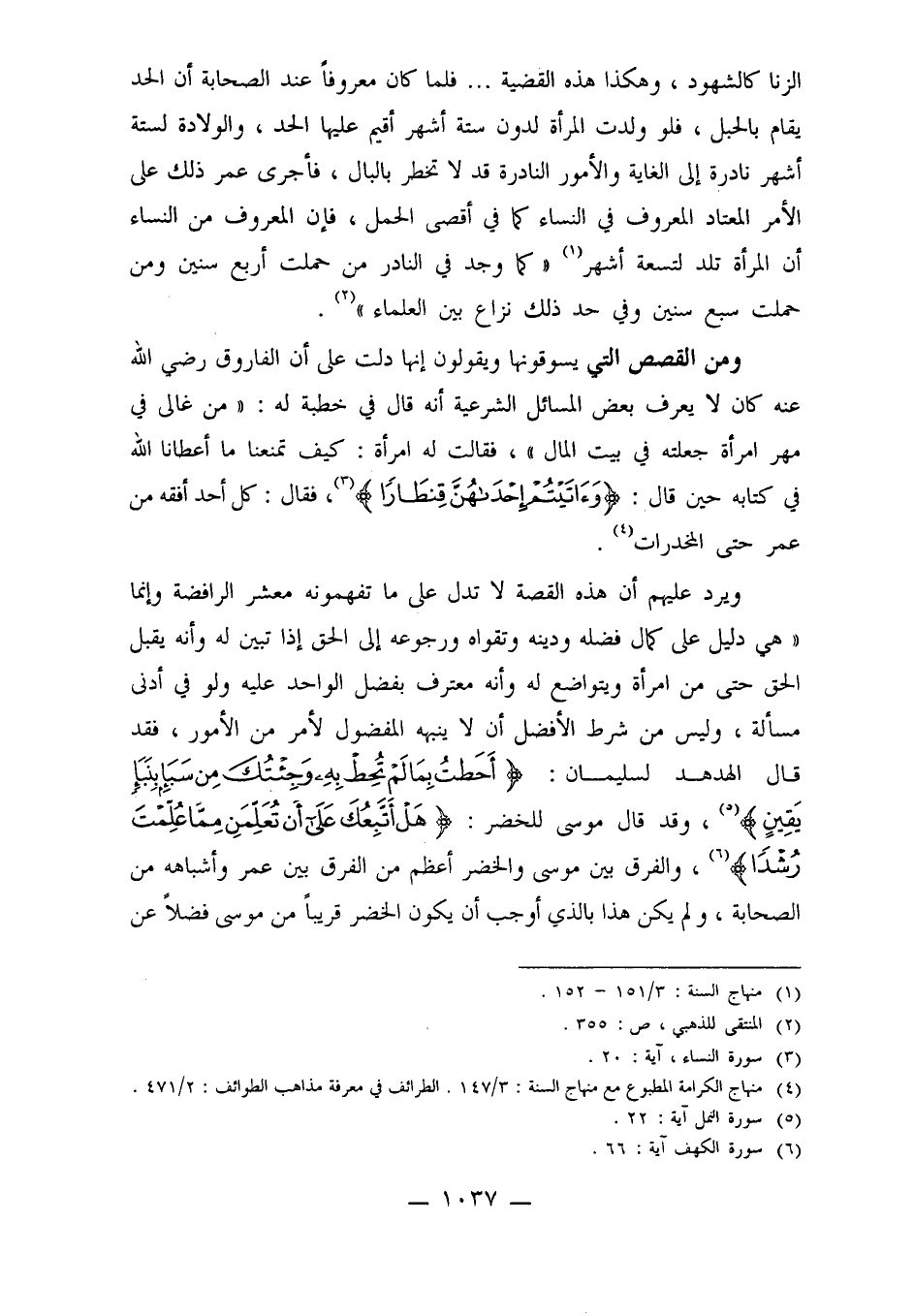 ويرد عليهم أن هذه القصة لا تدل على ما تفهمونه معشر الرافضة وإنما "هي دليل على كمال فضله ودينه وتقواه ورجوعه إلى الحق إذا تبين له وأنه يقبل الحق حتى من امرأة ويتواضع له وأنه معترف بفضل الواحد عليه ولو في أدنى مسألة، وليس من شرط الأفضل ألا ينبهه المفضول لأمر من الأمور، فقد قال الهدهد لسليمان: {أَحَطْتُ بِمَا لَمْ تُحِطْ بِهِ وَجِئْتُكَ مِنْ سَبَأٍ بِنَبَأٍ يَقِينٍ} 5، وقد قال موسى للخضر: {هَلْ أَتَّبِعُكَ عَلَى أَنْ تُعَلِّمَنِ مِمَّا عُلِّمْتَ رُشْداً} 6، والفرق بين موسى والخضر أعظم من الفرق بين عمر وأشباهه من الصحابة، ولم يكن هذا بالذي أوجب أن يكون الخضر قريباً من موسى فضلاً عن