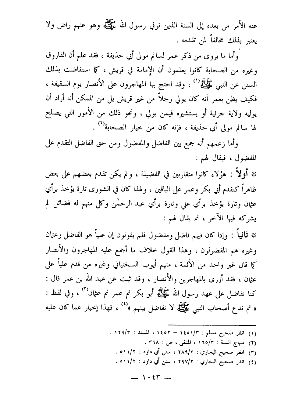وأما ما يروى من ذكر عمر لسالم مولى أبي حذيفة، فقد علم أن الفاروق وغيره من الصحابة كانوا يعلمون أن الإمامة في قريش، كما استفاضت بذلك السنن عن النبي صلى الله عليه وسلم1، وقد احتج بها المهاجرون على الأنصار يوم السقيفة، فكيف يظن بعمر أنه كان يولي رجلاً من غير قريش بل من الممكن أنه أراد أن يوليه ولاية جزئية أو يستشيره فيمن يولي، ونحو ذلك من الأمور التي يصلح لها سالم مولى أبي حذيفة، فإنه كان من خيار الصحابة2.