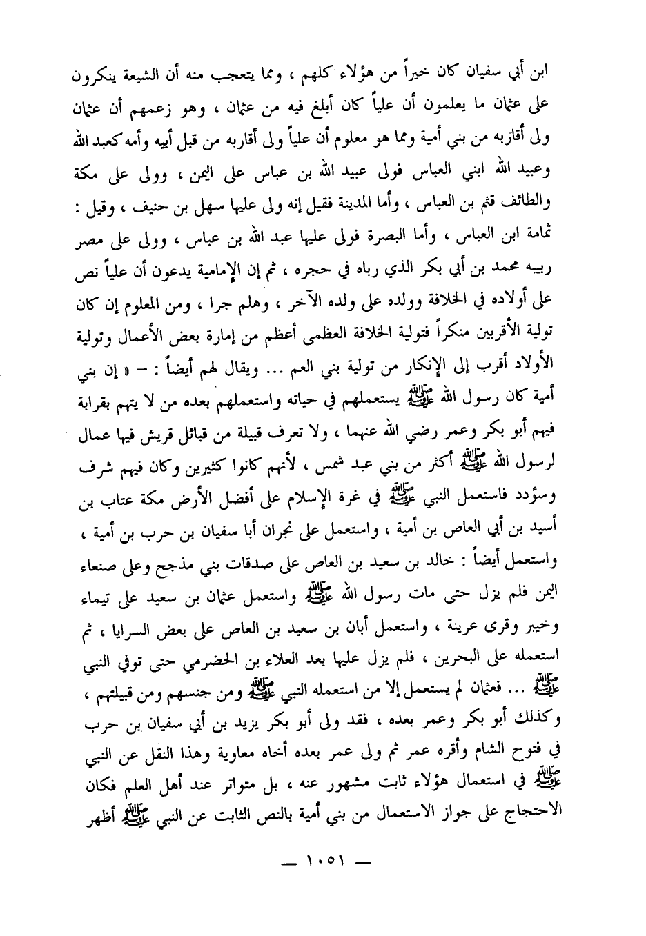 ابن أبي سفيان كان خيراً من هؤلاء كلهم، ومما يتعجب منه أن الشيعة ينكرون على عثمان ما يعلمون أن علياً كان أبلغ فيه من عثمان، وهو زعمهم أن عثمان ولى أقاربه من بني أمية ومما هو معلوم أن علياً ولى أقاربه من قبل أبيه وأمه كعبد الله وعبيد الله ابني العباس فولى عبيد بن عباس على اليمن، وولى على مكة والطائف قثم بن العباس، وأما المدينة فقيل إنه ولى عليها سهل بن حنيف، وقيل: ثمامة ابن العباس، وأما البصرة فولى عليها عبد الله بن عباس، وولى على مصر ربيبه محمد بن أبي بكر الذي رباه في حجره، ثم إن الإمامية يدعون أن علياً نص على أولاده في الخلافة وولده على ولده الآخر، وهلم جرا، ومن المعلوم إن كان تولية الأقربين منكراً فتولية الخلافة العظمى أعظم من إمارة بعض الأعمال وتولية الأولاد أقرب إلى الإنكار من تولية بني العم ... ويقال لهم أيضاً: "إن بني أمية كان رسول الله صلى الله عليه وسلم يستعملهم في حياته واستعملهم بعده من لا يتهم بقرابة فيهم أبو بكر وعمر رضي الله عنهما، ولا تعرف قبيلة من قبائل قريش فيها عمال لرسول الله صلى الله عليه وسلم أكثر من بني عبد شمس، لأنهم كانوا كثيرين وكان فيهم شرف وسؤدد فاستعمل النبي صلى الله عليه وسلم في غرة الإسلام على أفضل الأرض مكة عتاب بن أسيد بن أبي العاص بن أمية، واستعمل على نجران أبا سفيان بن حرب بن أمية، واستعمل أيضاً: خالد بن سعيد بن العاص على صدقات بني مذجح وعلى صنعاء اليمن فلم يزل حتى مات رسول الله صلى الله عليه وسلم واستعمل عثمان بن سعيد على تيماء وخيبر وقرى عرينة، واستعمل أبان بن سعيد بن العاص على بعض السرايا، ثم استعمله على البحرين، فلم يزل عليها بعد العلاء بن الحضرمي حتى توفي النبي صلى الله عليه وسلم..فعثمان لم يستعمل إلا من استعمله النبي صلى الله عليه وسلم ومن جنسهم ومن قبيلتهم، وكذلك أبو بكر وعمر بعده، فقد ولى أبو بكر يزيد بن أبي سفيان بن حرب في فتوح الشام وأقره عمر ثم ولى عمر بعده أخاه معاوية وهذا النقل عن النبي صلى الله عليه وسلم في استعمال هؤلاء ثابت مشهور عنه، بل متواتر عند أهل العلم فكان الاحتجاج على جواز الاستعمال من بني أمية بالنص الثابت عن النبي صلى الله عليه وسلم أظهر