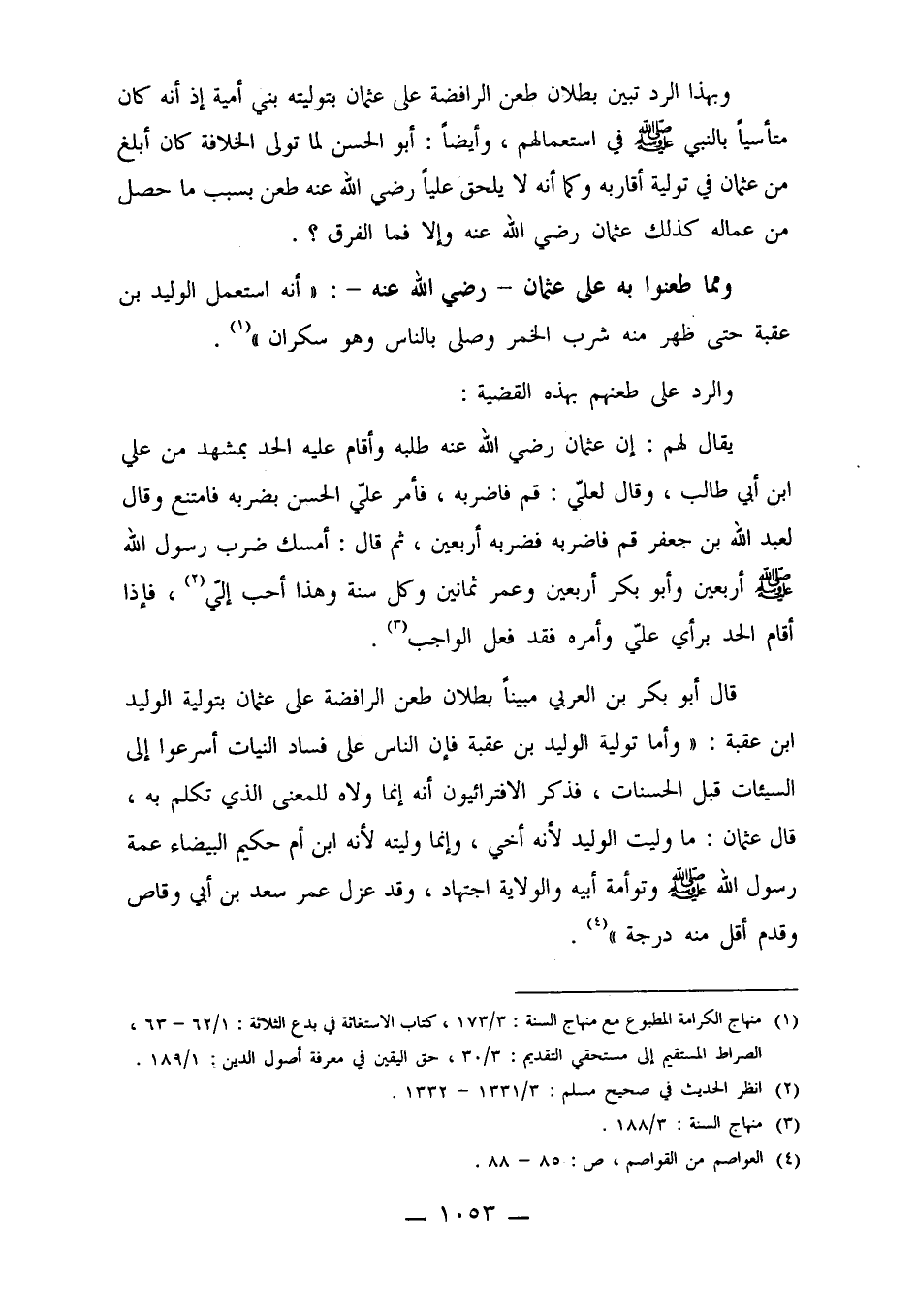 وبهذا الرد تبين بطلان طعن الرافضة على عثمان بتوليته بني أمية إذ أنه كان متأسياً بالنبي صلى الله عليه وسلم في استعمالهم، وأيضاً: أبو الحسن لما تولى الخلافة كان أبلغ من عثمان في تولية أقاربه وكما أنه لا يلحق علياً رضي الله عنه طعن بسبب ما حصل من عماله كذلك عثمان رضي الله عنه وإلا فما الفرق؟