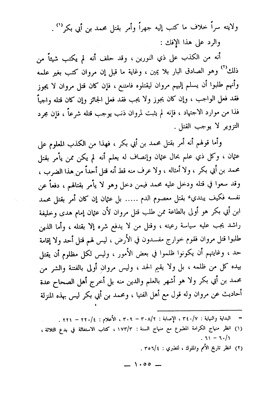 أنه من الكذب على ذي النورين، وقد حلف أنه لم يكتب شيئاً من ذلك2 وهو الصادق البار بلا يمين، وغاية ما قيل إن مروان كتب بغير علمه وأنهم طلبوا أن يسلم إليهم مروان ليقتلوه فامتنع، فإن كان قتل مروان لا يجوز فقد فعل الواجب، وإن كان يجوز ولا يجب فقد فعل الجائز، وإن كان قتله واجباً فذا من موارد الاجتهاد فإنه لم يثبت لمروان ذنب يوجب قتله شرعاً فإن مجرد التزوير لا يوجب القتل.