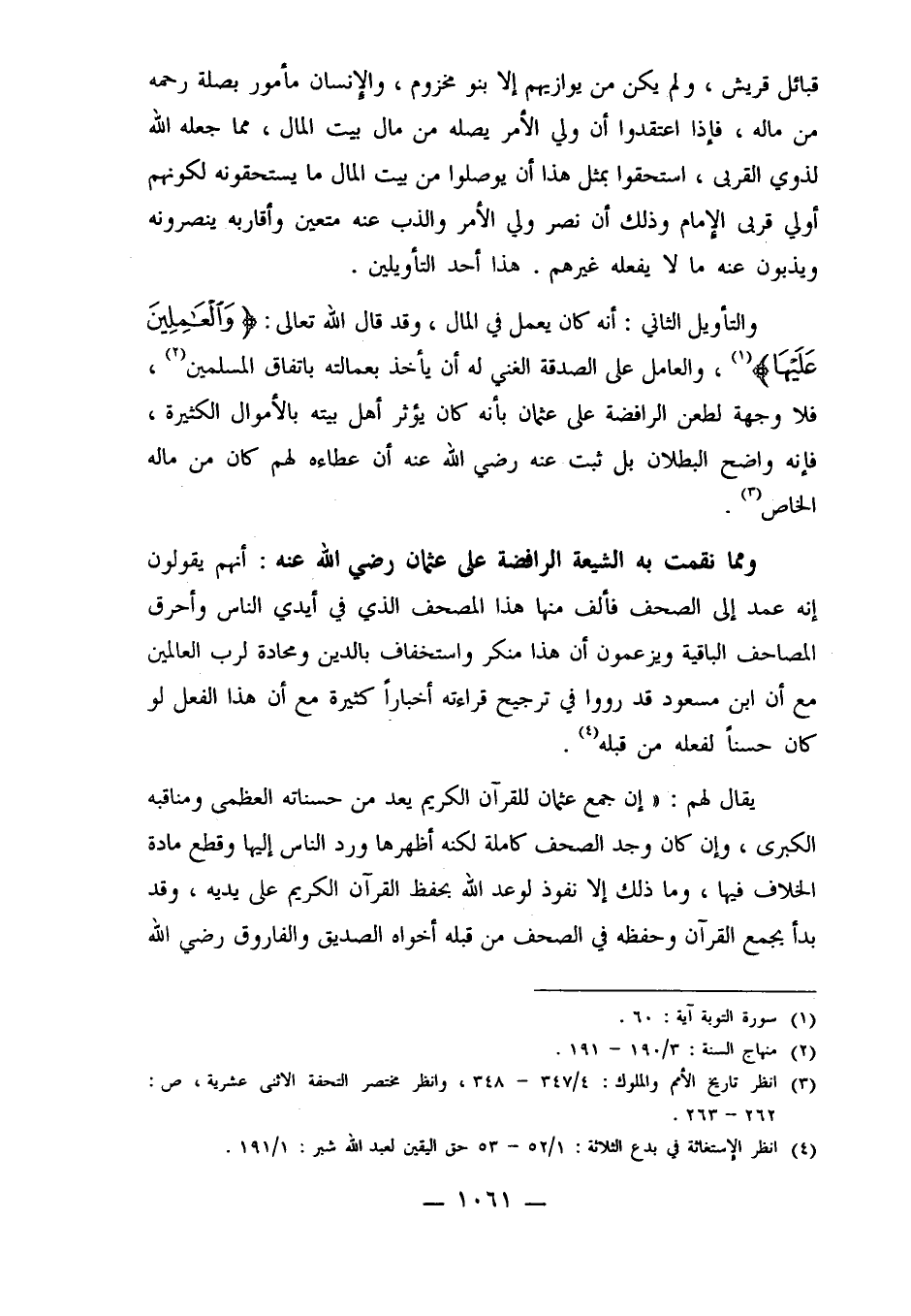 ومما نقمت به الشيعة الرافضة على عثمان رضي الله عنه: أنهم يقولون إنه عمد إلى الصحف فألف منها هذا المصحف الذي في أيدي الناس وأحرق المصاحف الباقية ويزعمون أن هذا منكر واستخفاف بالدين ومحادة لرب العالمين مع أن ابن مسعود قد رووا في ترجيح قراءته أخباراً كثيرة مع أن هذا الفعل لو كان حسناً لفعله من قبله4.
