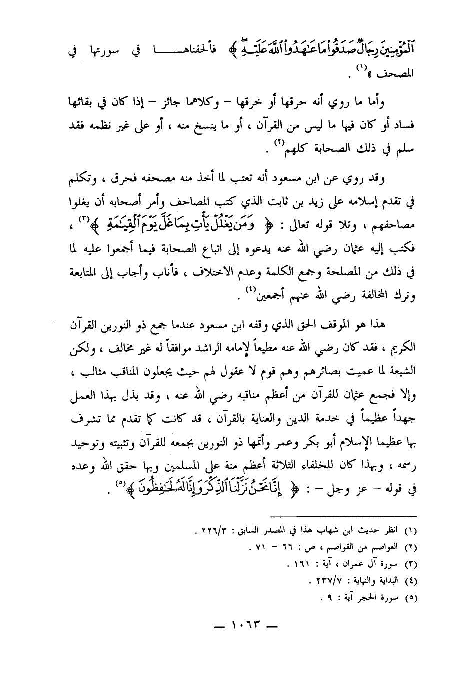 هذا هو الموقف الحق الذي وقفه ابن مسعود عندما جمع ذو النورين القرآن الكريم، فقد كان رضي الله عنه مطيعاً لإمامه الراشد موافقاً له غير مخالف، ولكن الشيعة لما عميت بصائرهم وهم قوم لا عقول لهم حيث يجعلون المناقب مثالب، وإلا فجمع عثمان للقرآن من أعظم مناقبه رضي الله عنه، وقد بذل بهذا العمل جهداً عظيماً في خدمة الدين والعناية بالقرآن، قد كانت كما تقدم مما تشرف بها عظيما الإسلام أبو بكر وعمر وأتمها ذو النورين بجمعه للقرآن وتثبيته وتوحيد رسمه، وبهذا كان للخلفاء الثلاثة أعظم منة على المسلمين وبها حقق الله وعده في قوله ـ عز وجل ـ: {إِنَّا نَحْنُ نَزَّلْنَا الذِّكْرَ وَإِنَّا لَهُ لَحَافِظُونَ} 5.