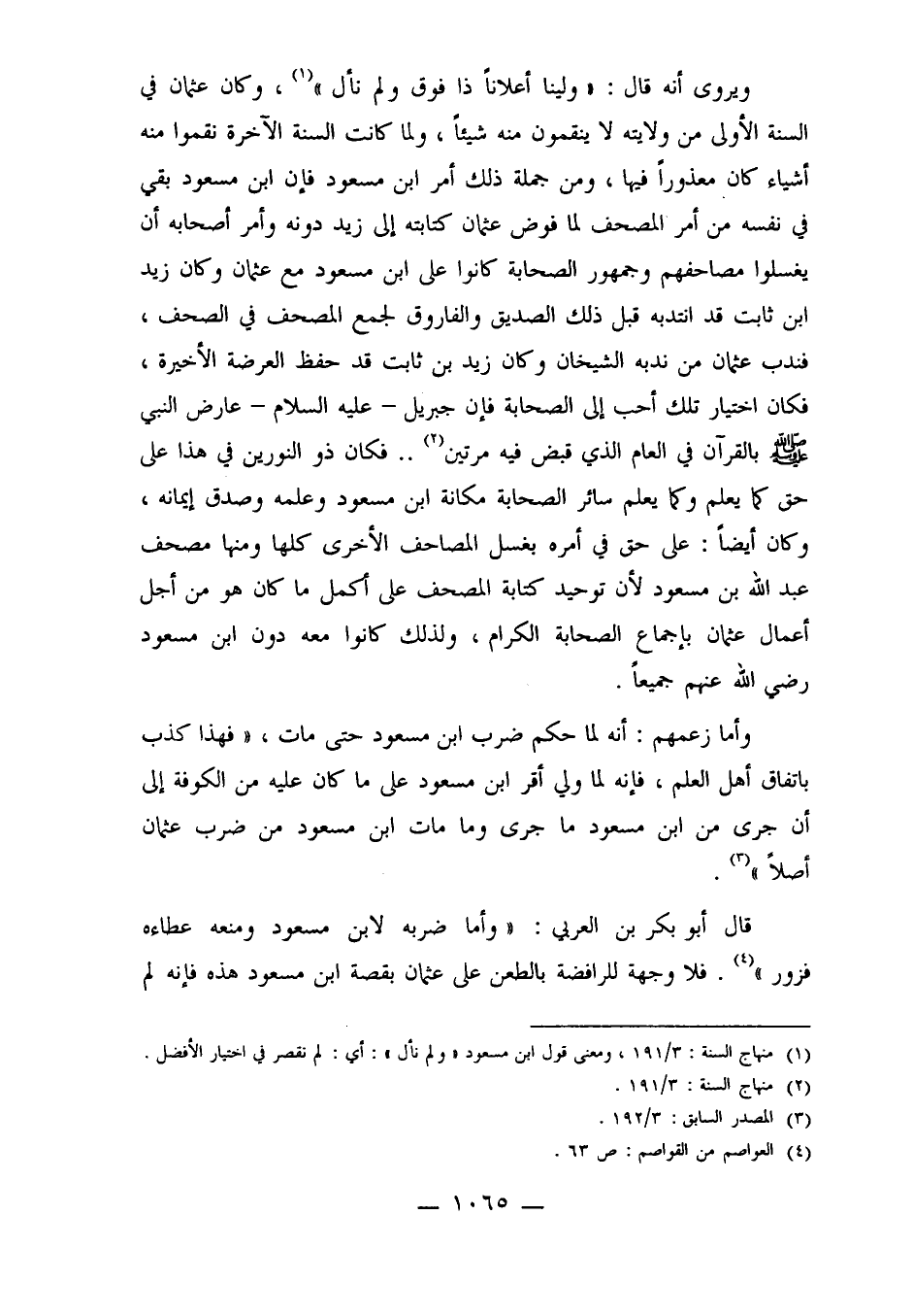 قال أبو بكر بن العربي: "وأما ضربه لابن مسعود ومنعه عطاءه فزور"4. فلا وجهة للرافضة بالطعن على عثمان بقصة ابن مسعود هذه فإنه لم