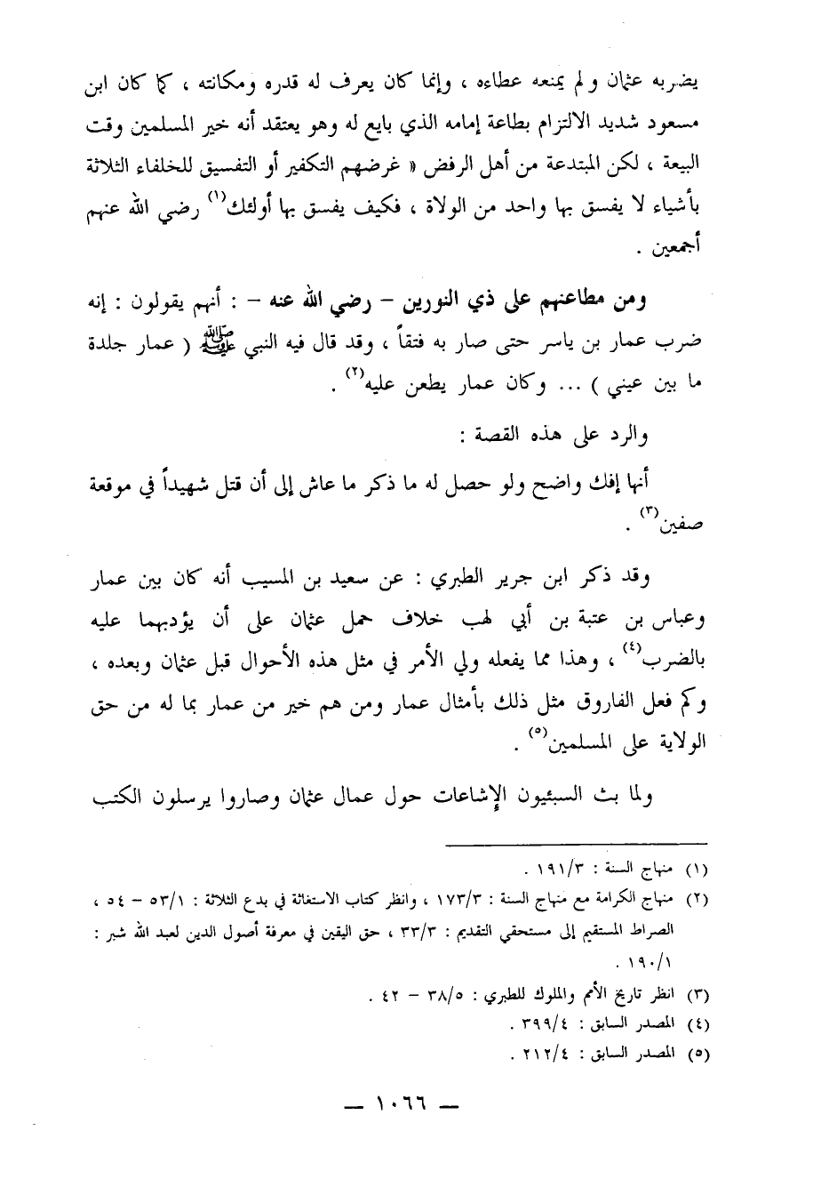 يضربه عثمان ولم يمنعه عطاءه، وإنما كان يعرف له قدره ومكانته، كما كان ابن مسعود شديد الالتزام بطاعة إمامه الذي بايع له وهو يعتقد أنه خير المسلمين وقت البيعة، لكن المبتدعة من أهل الرفض "غرضهم التكفير أو التفسيق للخلفاء الثلاثة بأشياء لا يفسق بها واحد من الولاة، فكيف يفسق بها أولئك1 رضي الله عنهم أجمعين.