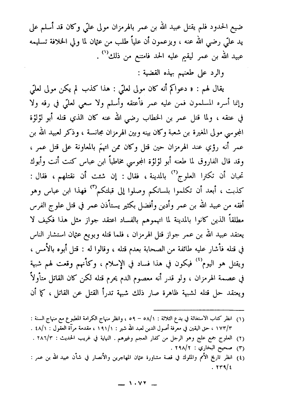 يقال لهم: "دعواكم أنه كان مولى لعلي: هذا كذب لم يكن مولى لعلي وإنما أسره المسلمون فمن عليه عمر فأعتقه وأسلم ولا سعي لعلي في رقه ولا في عتقه، ولما قتل عمر بن الخطاب رضي الله عنه كان الذي قتله أبو لؤلؤة المجوسي مولى المغيرة بن شعبة وكان بينه وبين الهرمزان مجانسة، وذكر لعبيد الله بن عمر أنه رؤي عند الهرمزان حين قتل وكان ممن اتهم بالمعاونة على قتل عمر، وقد قال الفاروق لما طعنه أبو لؤلؤة المجوسي مخاطباً ابن عباس كنت أنت وأبوك تحبان أن تكثرا العلوج2 بالمدينة، فقال: إن شئت أن نقتلهم، فقال: كذبت، أبعد أن تكلموا بلسانكم وصلوا إلى قبلتكم3 فهذا ابن عباس وهو أفقه من عبيد الله بن عمر وأدين وأفضل بكثير يستأذن عمر في قتل علوج الفرس مطلقاً الذين كانوا بالمدينة لما اتهموهم بالفساد اعتقد جواز مثل هذا فكيف لا يعتقد عبيد الله بن عمر جواز قتل الهرمزان، فلما قتله وبويع عثمان استشار الناس في قتله فأشار عليه طائفة من الصحابة بعدم قتله وقالوا له: قتل أبوه بالأمس، ويقتل هو اليوم4 فيكون في هذا فساد في الإسلام، وكأنهم وقعت لهم شبهة في عصمة الهرمزان، ولو قدر أنه معصوم الدم يحرم قتله لكن كان القاتل متأولاً ويعتقد حل قتله لشبهة ظاهرة صار ذلك شبهة تدرأ القتل عن القاتل، كما أن