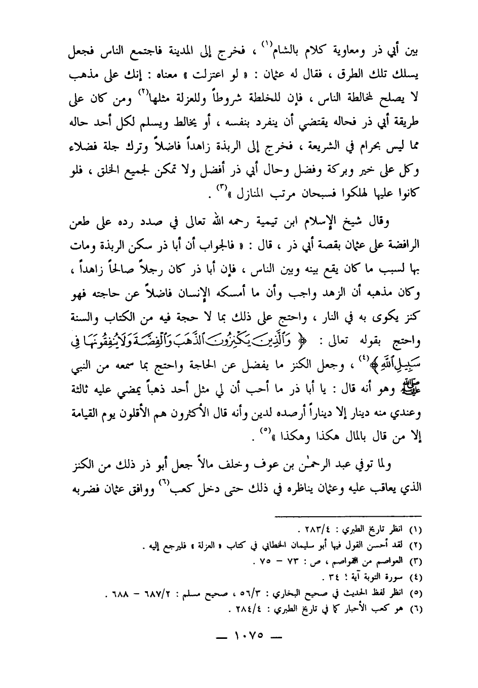 وقال شيخ الإسلام ابن تيمية رحمه الله تعالى في صدد رده على طعن الرافضة على عثمان بقصة أبي ذر، قال: "فالجواب أن أبا ذر سكن الربذة ومات بها لسبب ما كان يقع بينه وبين الناس، فإن أبا ذر كان رجلاً صالحاً زاهداً، وكان مذهبه أن الزهد واجب وأن ما أمسكه الإنسان فاضلاً عن حاجته فهو كنز يكوى به في النار، واحتج على ذلك بما لا حجة فيه من الكتاب والسنة واحتج بقوله تعالى: {وَالَّذِينَ يَكْنِزُونَ الذَّهَبَ وَالْفِضَّةَ وَلا يُنْفِقُونَهَا فِي سَبِيلِ اللَّهِ} 4، وجعل الكنز ما يفضل عن الحاجة واحتج بما سمعه من النبي صلى الله عليه وسلم وهو أنه قال: يا أبا ذر ما أحب أن لي مثل أحد ذهباً يمضي عليه ثالثة وعندي منه دينار إلا ديناراً أرصده لدين وأنه قال الأكثرون هم الأقلون يوم القيامة إلا من قال بالمال هكذا وهكذا"5.