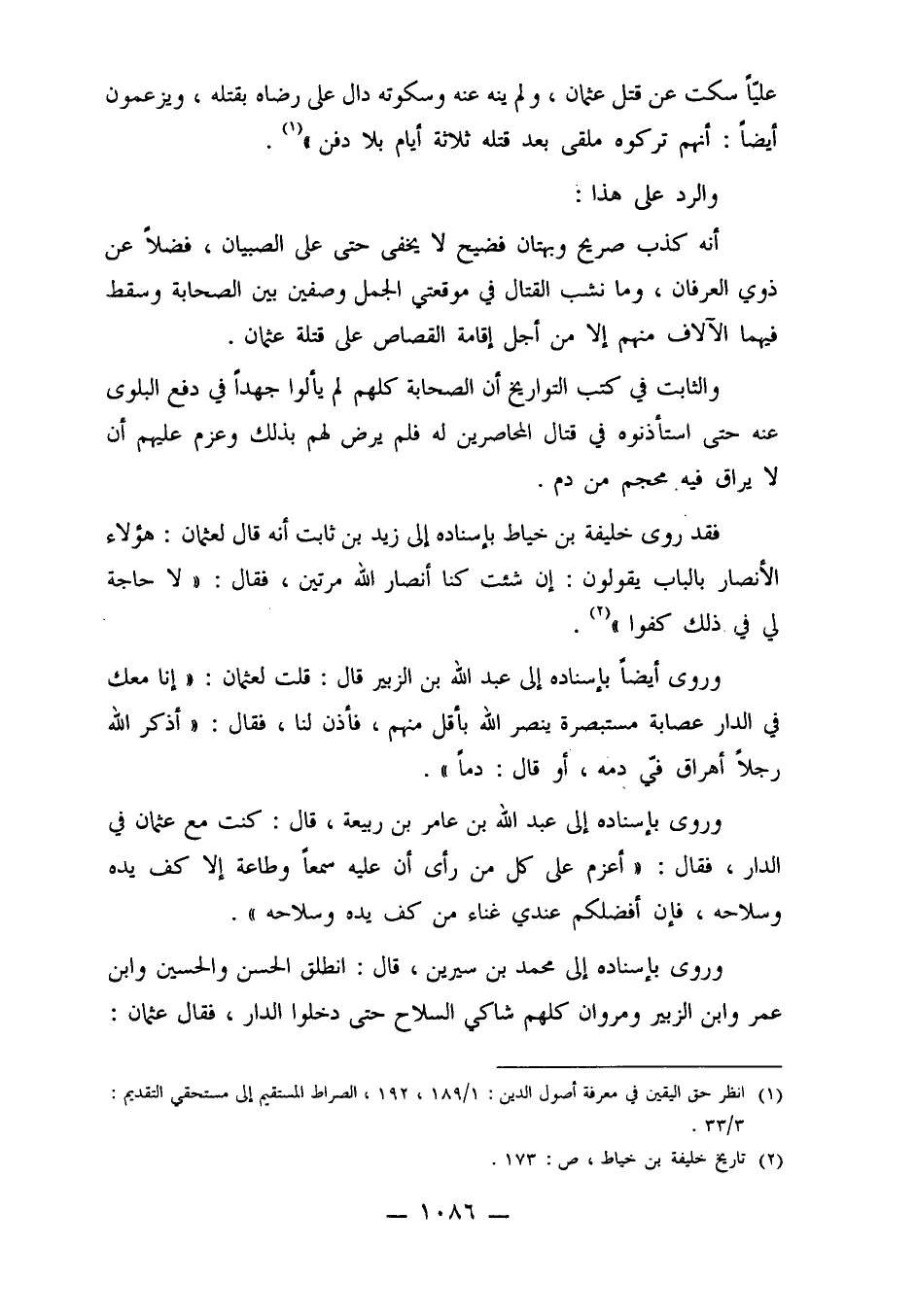 أنه كذب صريح وبهتان فضيح لا يخفى على الصبيان، فضلاً عن ذوي العرفان، وما نشب القتال في موقعتي الجمل وصفين بين الصحابة وسقط فيهما الآلاف منهم إلا من أجل إقامة القصاص على قتلة عثمان.