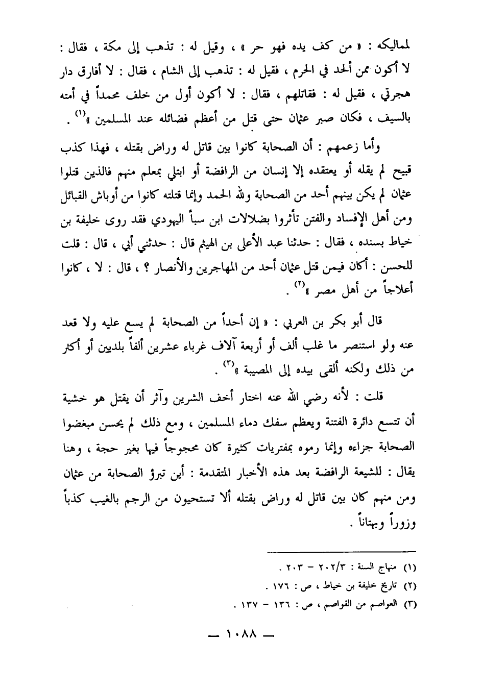 وأما زعمهم: أن الصحابة كانوا بين قاتل له وراض بقتله، فهذا كذب قبيح لم يقله أو يعتقده إلا إنسان من الرافضة أو ابتلي بمعلم منهم فالذين قتلوا عثمان لم يكن بينهم أحد من الصحابة ولله الحمد وإنما قتلته كانوا من أوباش القبائل ومن أهل الإفساد والفتن تأثروا بضلالات ابن سبأ اليهودي فقد روى خليفة بن خياط بسنده، فقال: حدثنا عبد الأعلى بن الهيثم قال: حدثني أبي، قال: قلت للحسن: أكان فيمن قتل عثمان أحد من المهاجرين والأنصار؟، قال: لا، كانوا أعلاجاً من أهل مصر"2.