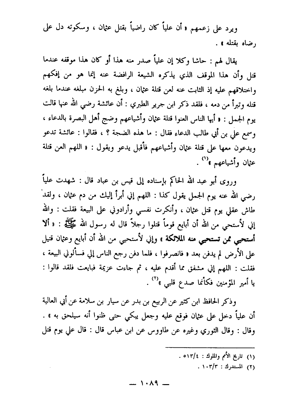 يقال لهم: حاشا وكلا إن علياً صدر منه هذا أو كان هذا موقفه عندما قتل وأن هذا الموقف الذي يذكره الشيعة الرافضة عنه إنما هو من إفكهم واختلاقهم عليه إذ الثابت عنه لعن قتلة عثمان، وبلغ به الحزن مبلغه عندما بلغه قتله وتبرأ من دمه، فلقد ذكر ابن جرير الطبري: أن عائشة رضي الله عنها قالت يوم الجمل: "أيها الناس العنوا قتلة عثمان وأشياعهم وضج أهل البصرة بالدعاء، وسمع علي بن أبي طالب الدعاء فقال: ما هذه الضجة؟، فقالوا: عائشة تدعو ويدعون معها على قتلة عثمان وأشياعهم فأقبل يدعو ويقول: "اللهم العن قتلة عثمان وأشياعهم"1.