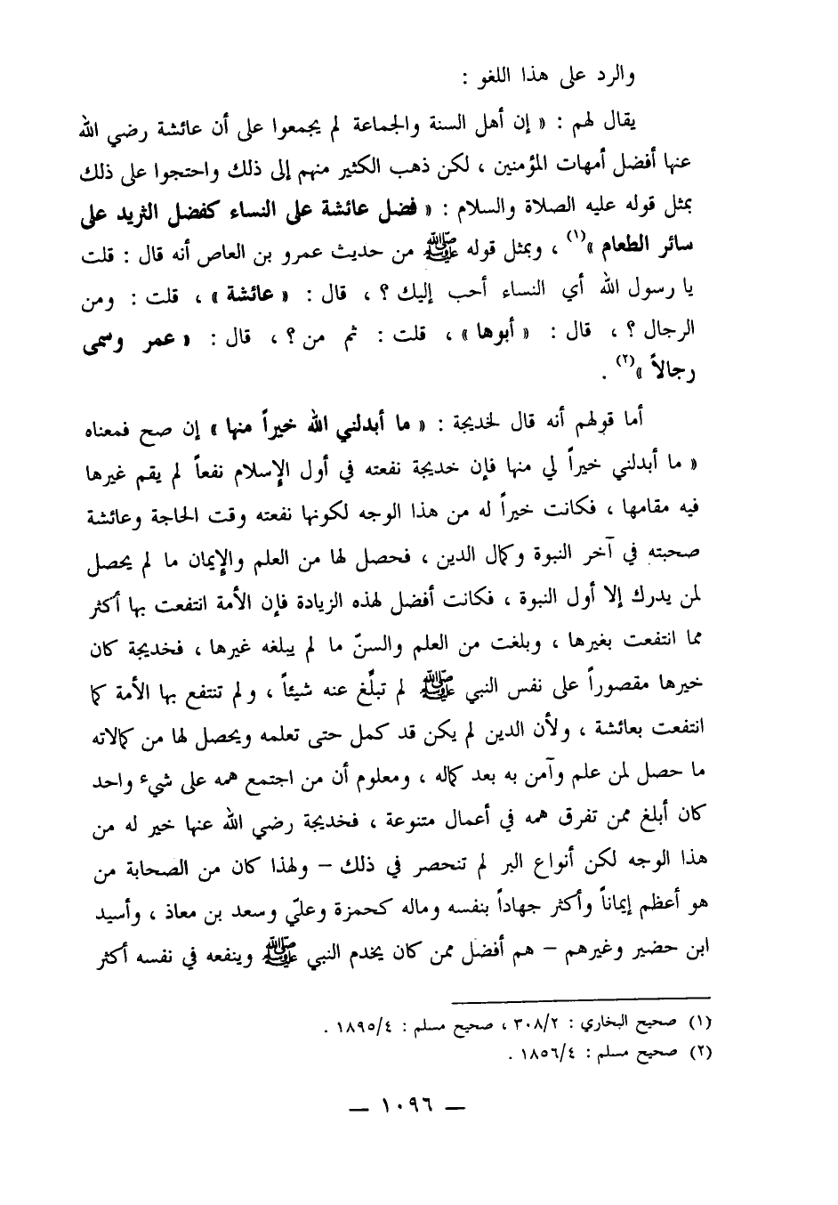 أما قولهم أنه قال لخديجة: "ما أبدلني الله خيراً منها" إن صح فمعناه "ما أبدلني خيراً لي منها فإن خديجة نفعته في أول الإسلام نفعاً لم يقم غيرها فيه مقامها، فكانت خيراً له من هذا الوجه لكونها نفعته وقت الحاجة وعائشة صحبته في آخر النبوة وكمال الدين، فحصل لها من العلم والإيمان ما لم يحصل لمن يدرك إلا أول النبوة، فكانت أفضل لهذه الزيادة فإن الأمة انتفعت بها أكثر مما انتفعت بغيرها، وبلغت من العلم والسن ما لم يبغله غيرها، فخديجة كان خيرها مقصوراً على نفس النبي صلى الله عليه وسلم لم تبلغ عنه شيئاً، ولم تنتفع بها الأمة كما انتفعت بعائشة، ولأن الدين لم يكن قد كمل حتى تعلمه ويحصل لها من كمالاته ما حصل لمن علم وآمن به بعد كماله، ومعلوم أن من اجتمع همه على شيء واحد كان أبلغ ممن تفرق همه في أعمال متنوعة، فخديجة رضي الله عنه خير له من هذا الوجه لكن أنواع البر لم تنحصر في ذلك ـ ولهذا كان من الصحابة من هو أعظم إيماناً وأكثر جهاداً بنفسه وماله كحمزة وعلي وسعد بن معاذ، وأسيد بن حضير وغيرهم ـ هم أفضل ممن كان يخدم النبي صلى الله عليه وسلم وينفعه في نفسه أكثر