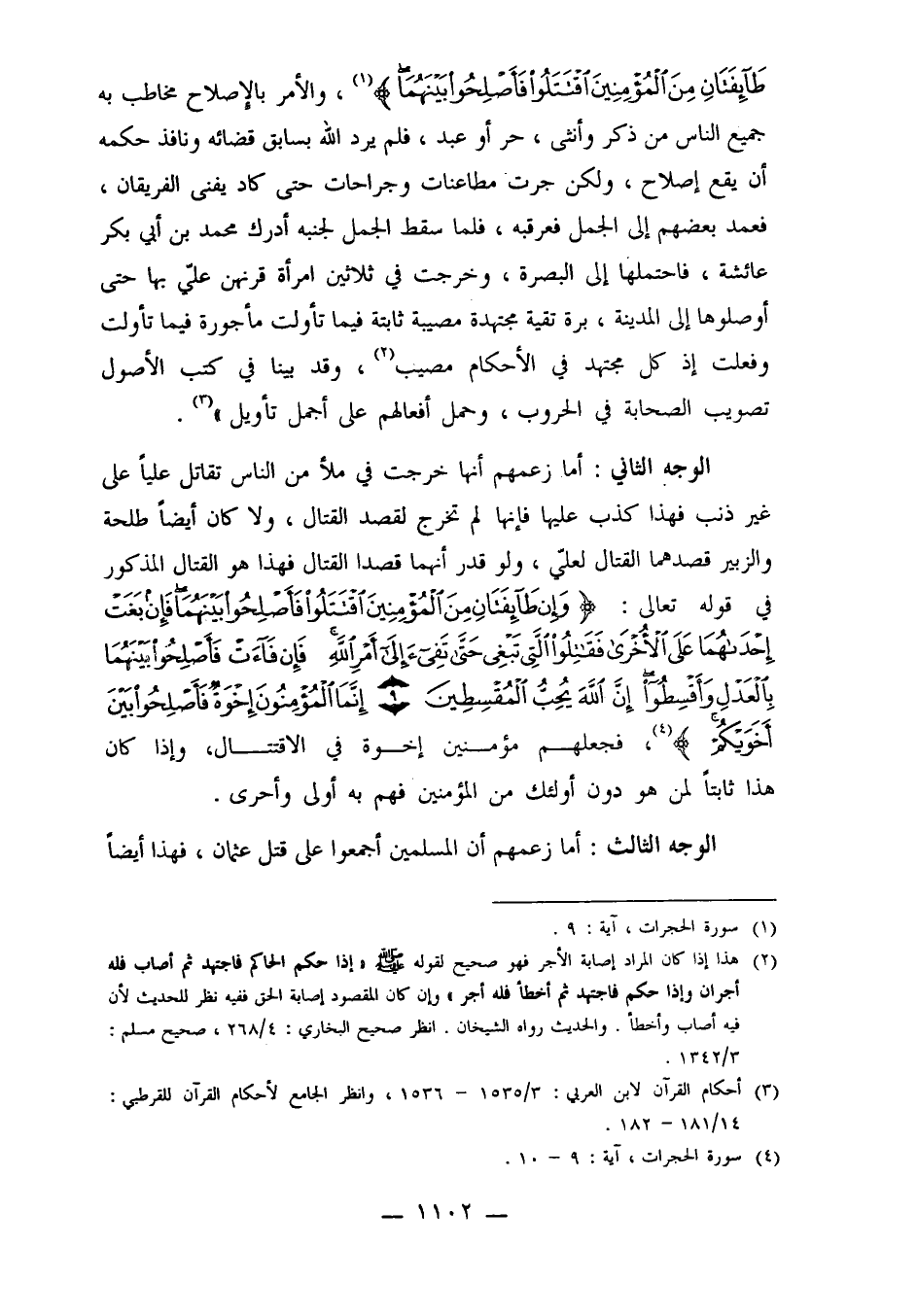 الوجه الثاني: أما زعمهم أنها خرجت في ملأ من الناس تقاتل علياً على غير ذنب فهذا كذب عليها فإنها لم تخرج لقصد القتال، ولا كان أيضاً طلحة والزبير قصدهما القتال لعلي، ولو قدر انهما قصدا القتال فهذا هو القتال المذكور في قوله تعالى: {وَإِنْ طَائِفَتَانِ مِنَ الْمُؤْمِنِينَ اقْتَتَلُوا فَأَصْلِحُوا بَيْنَهُمَا فَإِنْ بَغَتْ إِحْدَاهُمَا عَلَى الأُخْرَى فَقَاتِلُوا الَّتِي تَبْغِي حَتَّى تَفِيءَ إِلَى أَمْرِ اللَّهِ فَإِنْ فَاءَتْ فَأَصْلِحُوا بَيْنَهُمَا بِالْعَدْلِ وَأَقْسِطُوا إِنَّ اللَّهَ يُحِبُّ الْمُقْسِطِينَ * إِنَّمَا الْمُؤْمِنُونَ إِخْوَةٌ فَأَصْلِحُوا بَيْنَ أَخَوَيْكُمْ} 4، فجعلهم مؤمنين أخوة في الاقتتال، وإذا كان هذا ثابتاً لمن هو دون أولئك من المؤمنين فهم به أولى وأحرى.