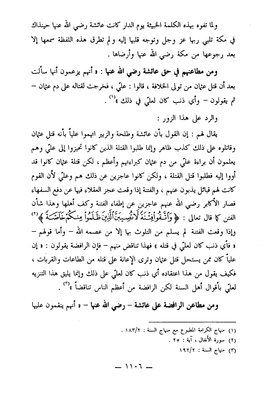 يقال لهم: إن القول بأن عائشة وطلحة والزبير اتهموا علياً بأنه قتل عثمان وقاتلوه على ذلك كذب ظاهر وإنما طلبوا القتلة الذين كانوا تحيزوا إلى علي وهم يعلمون أن براءة علي من دم عثمان كبراءتهم وأعظم، لكن قتلة عثمان كانوا قد أووا إليه فطلبوا قتل القتلة، ولكن كانوا عاجزين عن ذلك هم وعلي لأن القوم كانت لهم قبائل يذبون عنهم، والفتنة إذا وقعت عجز العقلاء فيها عن دفع السفهاء فصار الأكابر رضي الله عنهم عاجزين عن إطفاء الفتنة وكف أهلها وهذا شأن الفتن كما قال تعالى: {وَاتَّقُوا فِتْنَةً لا تُصِيبَنَّ الَّذِينَ ظَلَمُوا مِنْكُمْ خَاصَّةً} 2 وإذا وقعت الفتنة لم يسلم من التلوث بها إلا من عصمه الله ـ وأما قولهم ـ "فأي ذنب كان لعلي في قتله" فهذا تناقض منهم ـ فإن الرافضة يقولون: "إن علياً كان ممن يستحل قتل عثمان وترى الإعانة على قتله من الطاعات والقربات، فكيف يقول من هذا اعتقاده أي ذنب كان لعلي على ذلك وإنما يليق هذا التنزيه لعلي بأقوال أهل السنة لكن الرافضة من أعظم الناس تناقضاً"3.