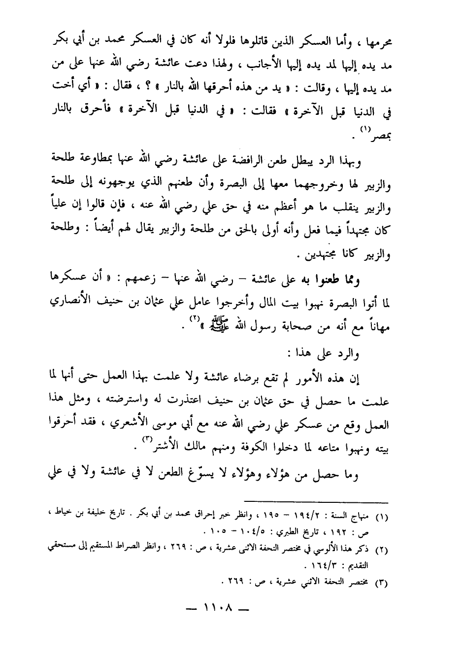 إن هذه الأمور لم تقع برضاء عائشة ولا علمت بهذا العمل حتى أنها لما علمت ما حصل في حق عثمان بن حنيف اعتذرت له واسترضته، ومثل هذا العمل وقع من عسكر علي رضي الله عنه مع أبي موسى الأشعري، فقد أحرقوا بيته ونهبوا متاعه لما دخلوا الكوفة ومنهم مالك الأشتر3.