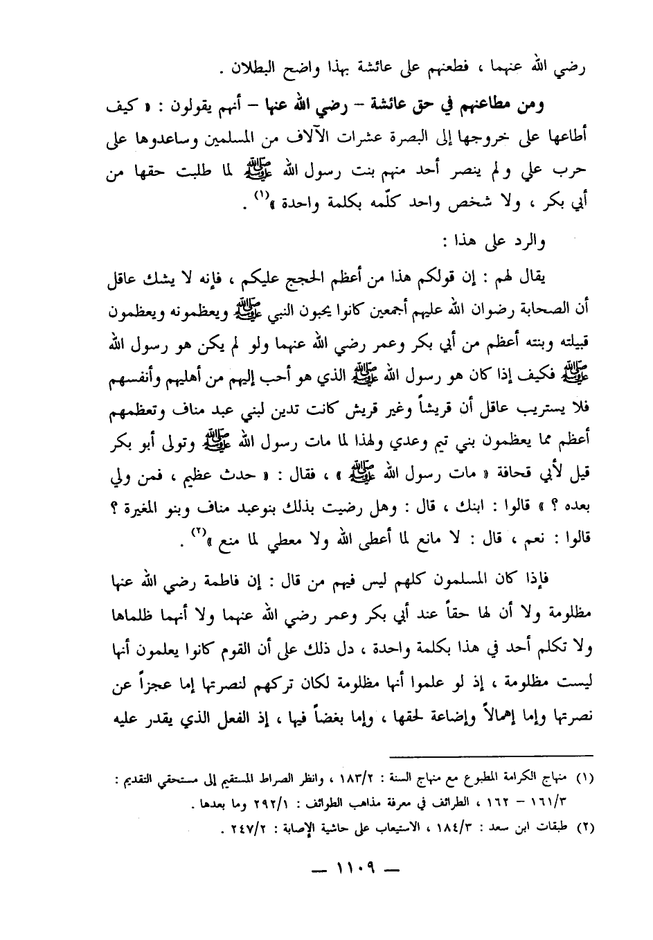 يقال لهم: إن قولكم هذا من أعظم الحجج عليكم، فإنه لا يشك عاقل أن الصحابة رضوان الله عليهم أجمعين كانوا يحبون النبي صلى الله عليه وسلم ويعظمونه ويعظمون قبيلته وبنته أعظم من أبي بكر وعمر رضي الله عنهما ولو لم يكن هو رسول الله صلى الله عليه وسلم فكيف إذا كان هو رسول الله صلى الله عليه وسلم الذي هو أحب إليهم من أهليهم وأنفسهم فلا يستريب عاقل أن قريشاً وغير قريش كانت تدين لبني عبد مناف وتعظمهم أعظم مما يعظمون بني تيم وعدي ولهذا لما مات رسول الله صلى الله عليه وسلم وتولى أبو بكر قيل لأبي قحافة "مات رسول الله صلى الله عليه وسلم"، فقال: "حدث عظيم، فمن ولي بعده؟ "قالوا: ابنك، قال: وهل رضيت بذلك بنو عبد مناف وبنو المغيرة؟ قالوا: نعم، قال: لا مانع لما أعطى الله ولا معطي لما منع"2.