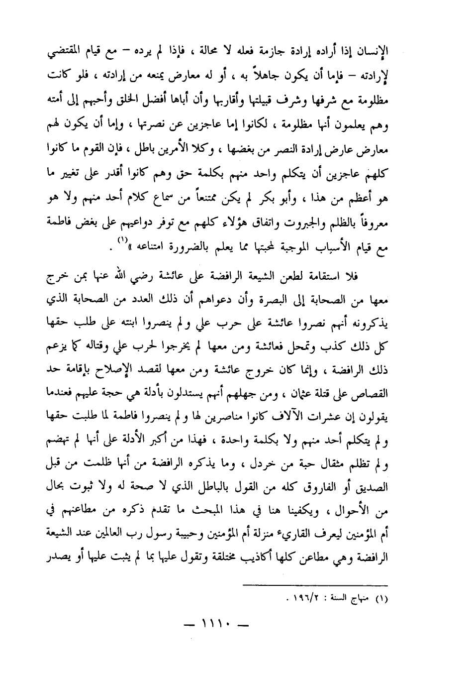 الإنسان إذا أراده إرادة جازمة فعله لا محالة، فإذا لم يرده ـ مع قيام المقتضي لإرادته ـ فإما أن يكون جاهلاً به أو له معارض يمنعه من إرادته، فلو كانت مظلومة مع شرفها وشرف قبيلتها وأقاربها وأن أباها أفضل الخلق وأحبهم إلى أمته وهم يعلمون أنها مظلومة، لكانوا إما عاجزين عن نصرتها، وإما أن يكون لهم معارض عارض إرادة النصر من بغضها، وكلا الأمرين باطلن فإن القوم ما كانوا كلهم عاجزين أن يتكلم واحد منهم بكلمة حق وهم كانوا أقدر على تغيير ما هو أعظم من هذا، وأبو بكر لم يكن ممتنعاً من سماع كلام أحد منهم ولا هو معروفاً بالظلم والجبروت واتفاق هؤلاء كلهم مع توفر دواعيهم على بغض فاطمة مع قيام الأسباب الموجبة لمحبتها مما يعلم بالضرورة امتناعه"1.