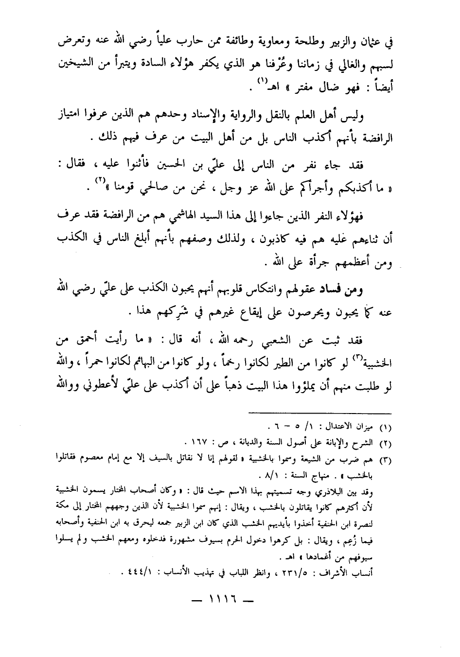 في عثمان والزبير وطلحة ومعاوية وطائفة ممن حارب علياً رضي الله عنه وتعرض لسبهم والغالي في زماننا وعُرْفنا هو الذي يكفر هؤلاء السادة ويتبرأ من الشيخين أيضاً: فهو ضال مفتر"أهـ1.