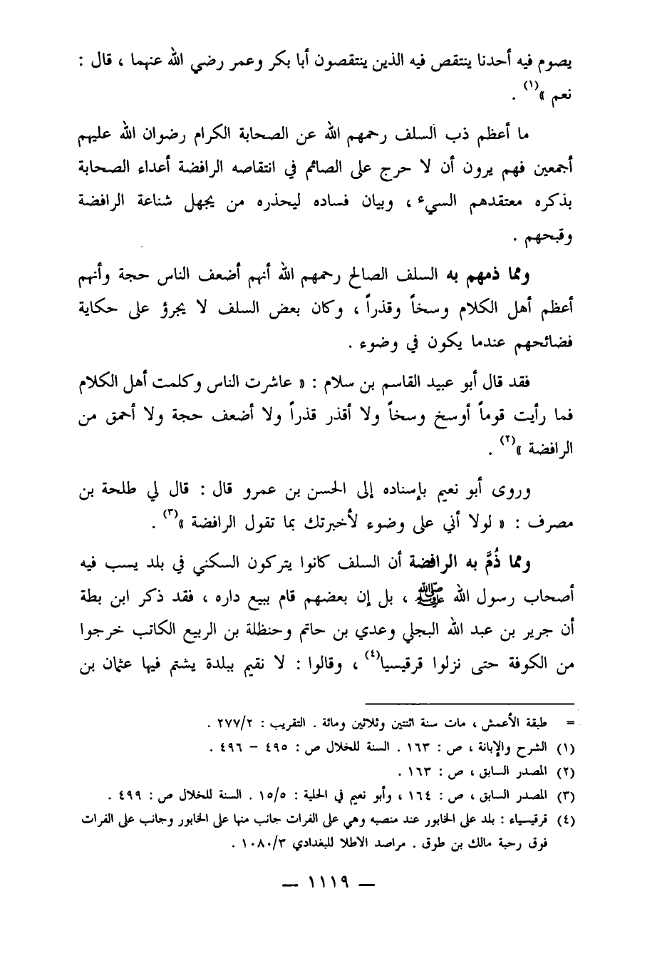 ومما ذُمّ به الرافضة أن السلف كانوا يتركون السكني في بلد يسب فيه أصحاب رسول الله صلى الله عليه وسلم، بل إن بعضهم قام ببيع داره، فقد ذكر ابن بطة أن جرير بن عبد الله البجلي وعدي بن حاتم وحنظلة بن الربيع الكاتب خرجوا من الكوفة حتى نزلوا قرقيسيا4، وقالوا: لا نقيم ببلدة يشتم فيها عثمان بن