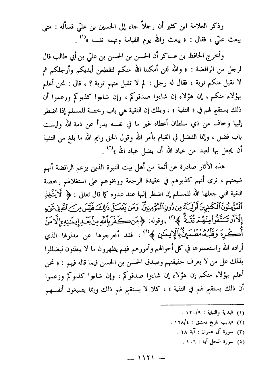 وأخرج الحافظ بن عساكر أن الحسن بن الحسن بن علي بن أبي طالب قال لرجل من الرافضة: "والله لئن أمكننا الله منكم لنقطعن أيديكم وأرجلكم ثم لا نقبل منكم توبة، فقال له رجل: لم لا تقبل منهم توبة؟، قال: نحن اعلم بهؤلاء منكم، إن هؤلاء إن شاءوا صدقوكم، وإن شاءوا كذبوكم وزعموا أن ذلك يستقيم لهم في "التقية"، ويلك إن التقية هي باب رخصة للمسلم إذا اضطر إليها وخاف من ذي سلطان أعطاه غير ما في نفسه يدرأ عن ذمة الله وليست باب فضل، وإنما الفضل في القيام بأمر الله وقول الحق وايم الله ما بلغ من التقية أن يجعل بها لعبد من عباد الله أن يضل عباد الله"2.