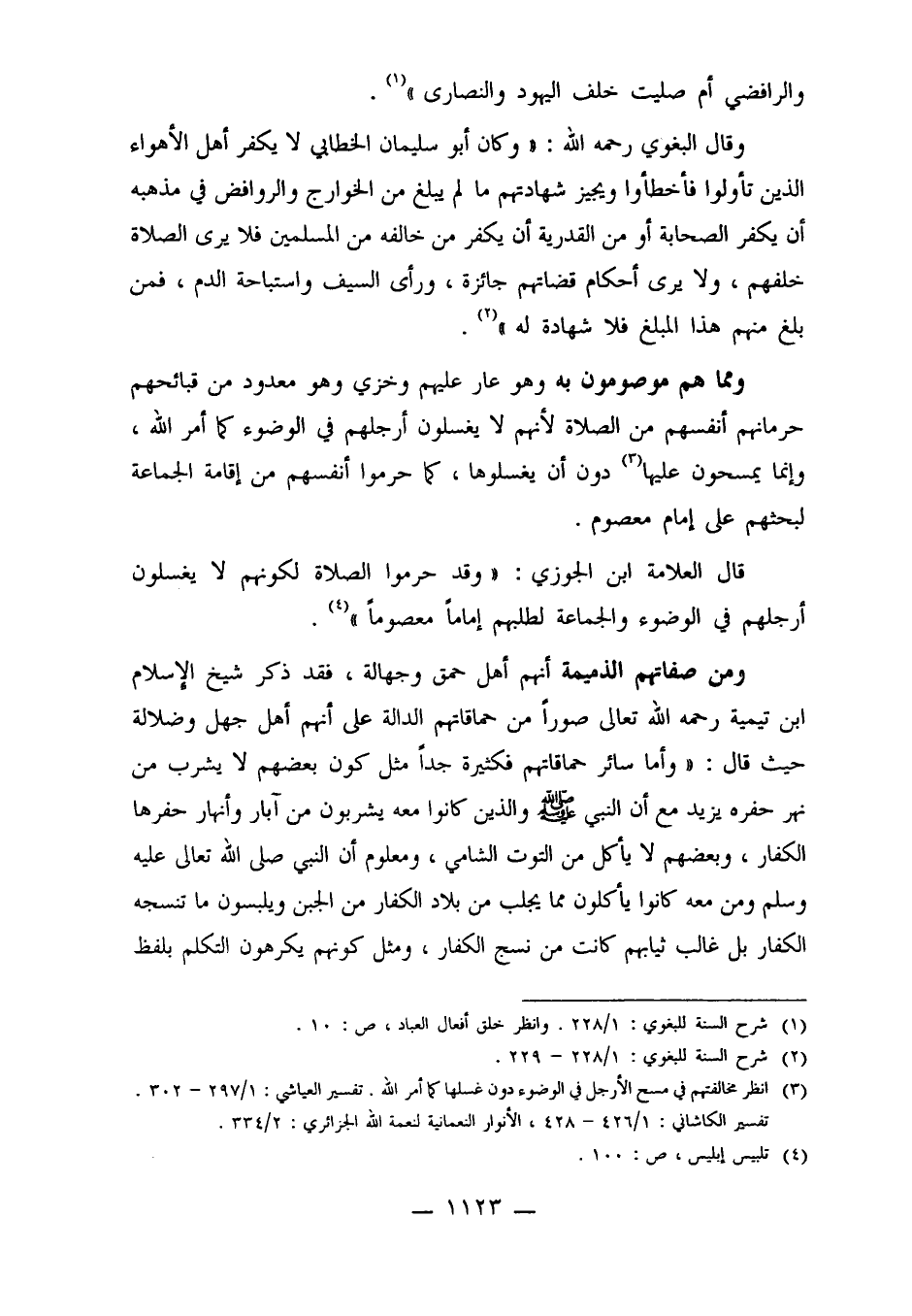 3ـ انظر مخالفتهم في مسح الأرجل في الوضوء دون غسلهما كما أمر الله. تفسير العياشي 1/297-302، تفسير الكاشاني 1/426-428، الأنوار النعمانية لنعمة الله الجزائري 2/334.