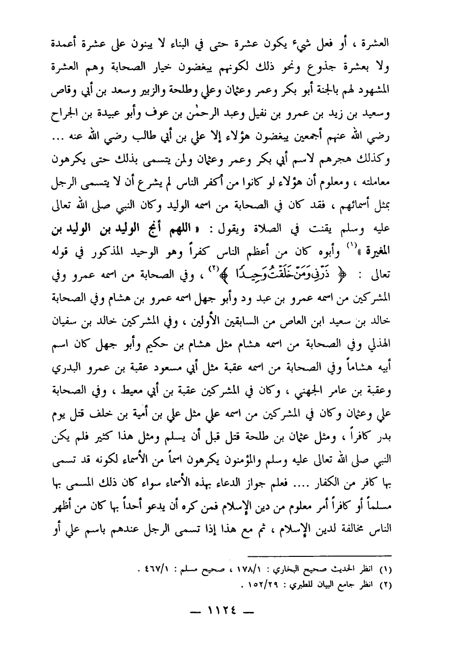 العشرة، أو فعل شيء يكون عشرة حتى في البناء لا يبنون على عشرة أعمدة ولا بعشرة جذوع ونحو ذلك لكونهم يبغضون خيار الصحابة وهم العشرة المشهود لهم بالجنة أبو بكر وعمر وعثمان وعلي وطلحة والزبير وسعد بن أبي وقاص وسعيد بن زيد بن عمرو بن نفيل وعبد الرحمن بن عوف وأبو عبيدة بن الجراح رضي الله عنهم أجمعين يبغضون هؤلاء إلا علي بن أبي طالب رضي الله عنه ... وكذلك هجرهم لاسم أبي بكر وعمر وعثمان ولمن يتسمى بذلك حتى يكرهون معاملته، ومعلوم أن هؤلاء لو كانوا من أكفر الناس لم يشرع أن لا يتسمى الرجل بمثل أسمائهم، فقد كان في الصحابة من اسمه الوليد وكان النبي صلى الله تعالى عليه وسلم يقنت في الصلاة ويقول: "اللهم أنج الوليد بن الوليد بن المغيرة" 1 وأبوه كان من أعظم الناس كفراً وهو الوحيد المذكور في قوله تعالى: {ذَرْنِي وَمَنْ خَلَقْتُ وَحِيداً} 2، وفي الصحابة من اسمه عمرو وفي المشركين من اسمه عمرو بن عبد ود وأبو جهل اسمه عمرو بن هشام وفي الصحابة خالد بن سعيد بن العاص من السابقين الأولين، وفي المشركين خالد بن سفيان الهذلي وفي الصحابة من اسمه هشام مثل هشام بن حكيم وأبو جهل كان اسم أبيه هشاماً وفي الصحابة من اسمه عقبة مثل أبي مسعود عقبة بن عمرو البدري وعقبة بن عامر الجهني، وكان في المشركين عقبة بن أبي معيط، وفي الصحابة علي وعثمان وكان في المشركين من اسمه علي مثل علي بن أمية بن خلف قتل يوم بدر كافراً، ومثل عثمان بن طلحة قتل قبل أن يسلم ومثل هذا كثير فلم يكن النبي صلى الله تعالى عليه وسلم والمؤمنون يكرهون اسماً من الأسماء لكونه قد تسمى بها كافر من الكفار ... فعلم جواز الدعاء بهذه الأسماء سواء كان ذلك المسمى بها مسلماً أو كافراً أمر معلوم من دين الإسلام فمن كره أن يدعو أحداً بها كان من أظهر الناس مخالفة لدين الإسلام، ثم مع هذا إذا تسمى الرجل عندهم باسم علي أو