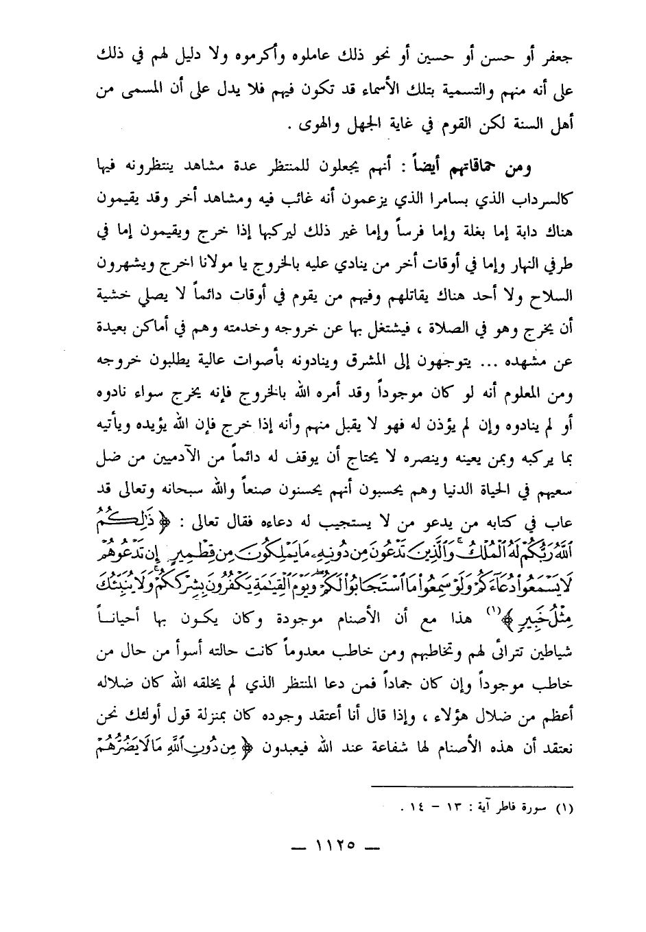 ومن حماقاتهم أيضاً: "أنهم يجعلون للمنتظر عدة مشاهد ينتظرونه فيها كالسرداب الذي بسامرا الذي يزعمون أنه غائب فيه ومشاهد أخر وقد يقيمون هناك دابة إما بغلة وإما فرساً وإما غير ذلك ليركبها إذا خرج ويقيمون إما في طرفي النهار وإما في أوقات أخر من ينادي عليه بالخروج يا مولانا اخرج ويشهرون السلاح ولا أحد هناك يقاتلهم وفيهم من يقوم في أوقات دائماً لا يصلي خشية أن يخرج وهو في الصلاة، فيشتغل بها عن خروجه وخدمته وهم في أماكن بعيدة عن مشهده ... يتوجهون إلى المشرق وينادونه بأصوات عالية يطلبون خروجه ومن المعلوم أنه لو كان موجوداً وقد أمره الله بالخروج فإنه يخرج سواء نادوه أو لم ينادوه وإن لم يؤذن له فهو لا يقبل منهم وأنه إذا خرج فإن الله يؤيده ويأتيه بما يركبه وبمن يعينه وينصره لا يحتاج أن يوقف له دائماً من الآدميين من ضل سعيهم في الحياة الدنيا وهم يحسبون أنهم يحسنون صنعاً والله سبحانه وتعالى قد عاب في كتابه من يدعو من لا يستجيب له دعاءه فقال تعالى: {ذَلِكُمُ اللَّهُ رَبُّكُمْ لَهُ الْمُلْكُ وَالَّذِينَ تَدْعُونَ مِنْ دُونِهِ مَا يَمْلِكُونَ مِنْ قِطْمِيرٍ * إِنْ تَدْعُوهُمْ لا يَسْمَعُوا دُعَاءَكُمْ وَلَوْ سَمِعُوا مَا اسْتَجَابُوا لَكُمْ وَيَوْمَ الْقِيَامَةِ يَكْفُرُونَ بِشِرْكِكُمْ وَلا يُنَبِّئُكَ مِثْلُ خَبِيرٍ} 1 هذا مع أن الأصنام موجودة وكان يكون بها أحياناً شياطين تترائى لهم وتخاطبهم ومن خاطب معدوماً كانت حالته أسوأ من حال من خاطب موجوداً وإن كان جماداً فمن دعا المنتظر الذي لم يخلقه الله كان ضلاله أعظم من ضلال هؤلاء، وإذا قال أنا أعتقد وجوده كان بمنزلة قول أولئك نحن نعتقد أن هذه الأصنام لها شفاعة عند الله فيعبدون {مِنْ دُونِ اللَّهِ مَا لا يَضُرُّهُمْ