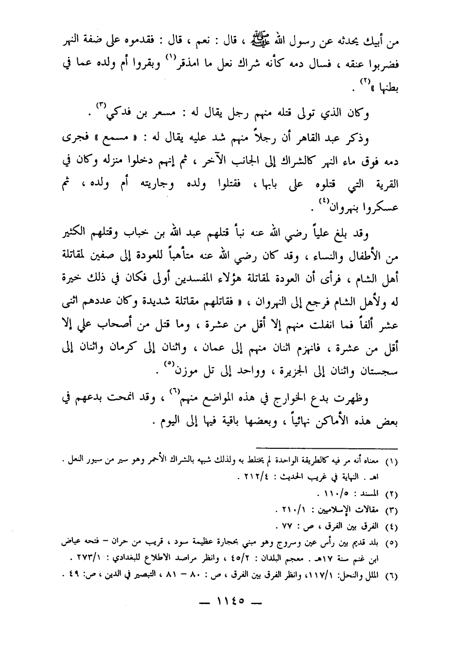 وذكر عبد القاهر أن رجلاً منهم شد عليه يقال له: "مسمع" فجرى دمه فوق ماء النهر كالشراك إلى الجانب الآخر، ثم إنهم دخلوا منزله وكان في القرية التي قتلوه على بابها، فقتلوا ولده وجاريته أم ولده، ثم عسكروا بنهروان4.