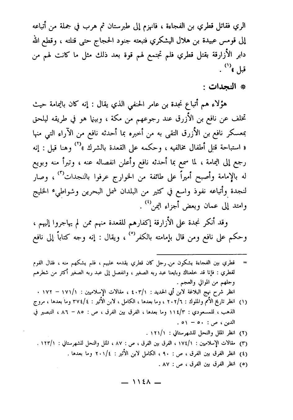 وقد أنكر نجدة على الأزارقة إكفارهم للقعدة منهم ممن لم يهاجروا إليهم، وحكم على نافع ومن قال بإمامته بالكفر5، ويقال: إنه وجه كتاباً إلى نافع