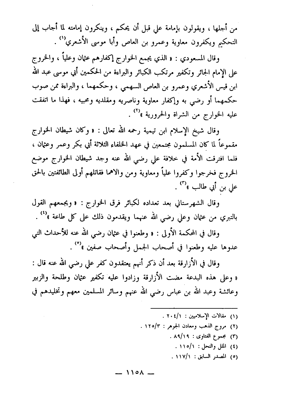 وقال الشهرستاني بعد تعداده لكبائر فرق الخوارج: "ويجمعهم القول بالتبري من عثمان وعلي رضي الله عنهما ويقدمون ذلك على كل طاعة"4.