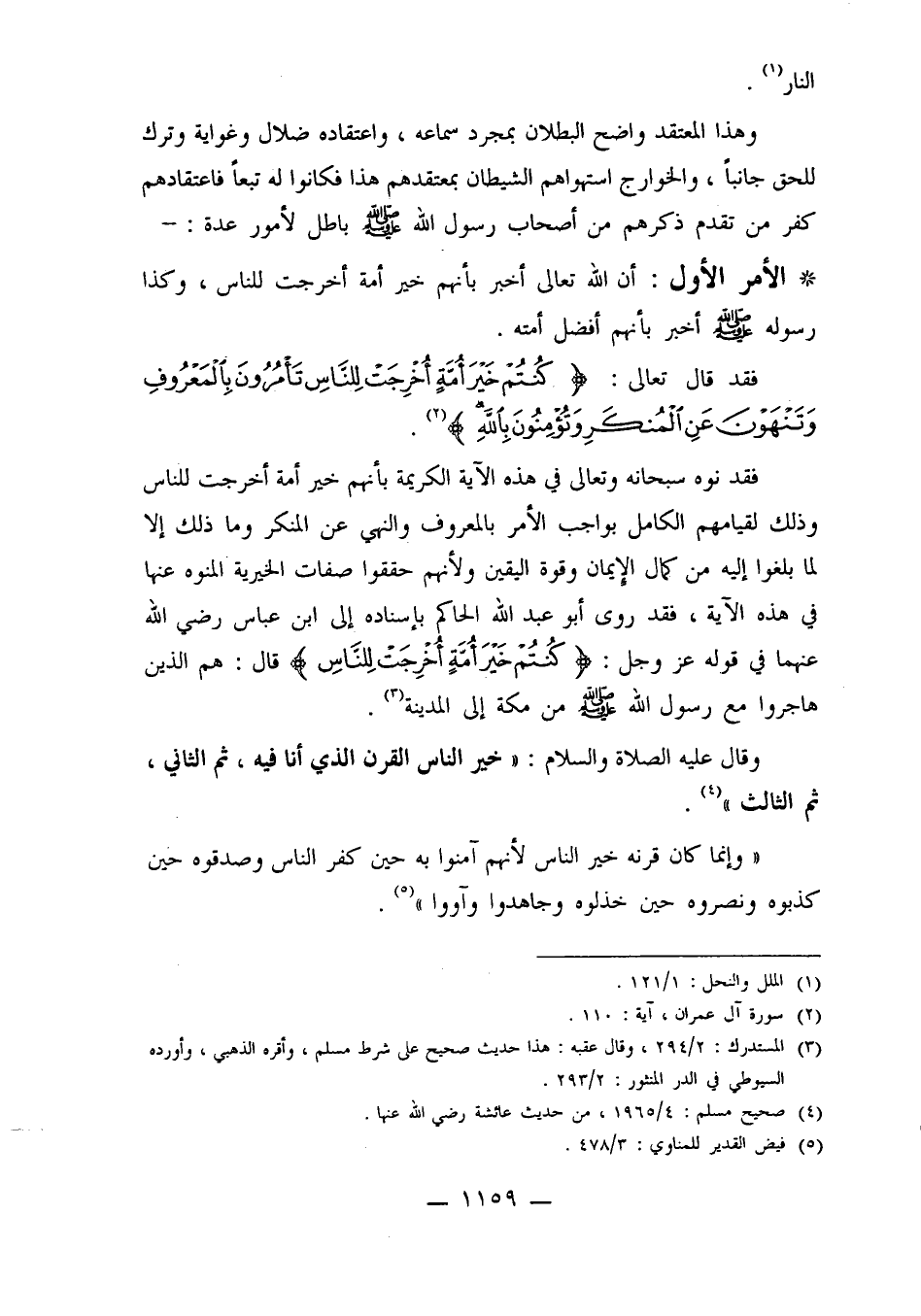 فقد نوه سبحانه وتعالى في هذه الآية الكريمة بأنهم خير أمة أخرجت للناس وذلك لقيامهم الكامل بواجب الأمر بالمعروف والنهي عن المنكر وما ذلك إلا لما بلغوا إليه من كمال الإيمان وقوة اليقين ولأنهم حققوا صفات الخيرية المنوه عنها في هذه الآية، فقد روى أبو عبد الله الحاكم بإسناده إلى ابن عباس رضي الله عنهما في قوله عز وجل: {كُنْتُمْ خَيْرَ أُمَّةٍ أُخْرِجَتْ لِلنَّاسِ} قال: هم الذين هاجروا مع رسول الله صلى الله عليه وسلم من مكة إلى المدينة3.