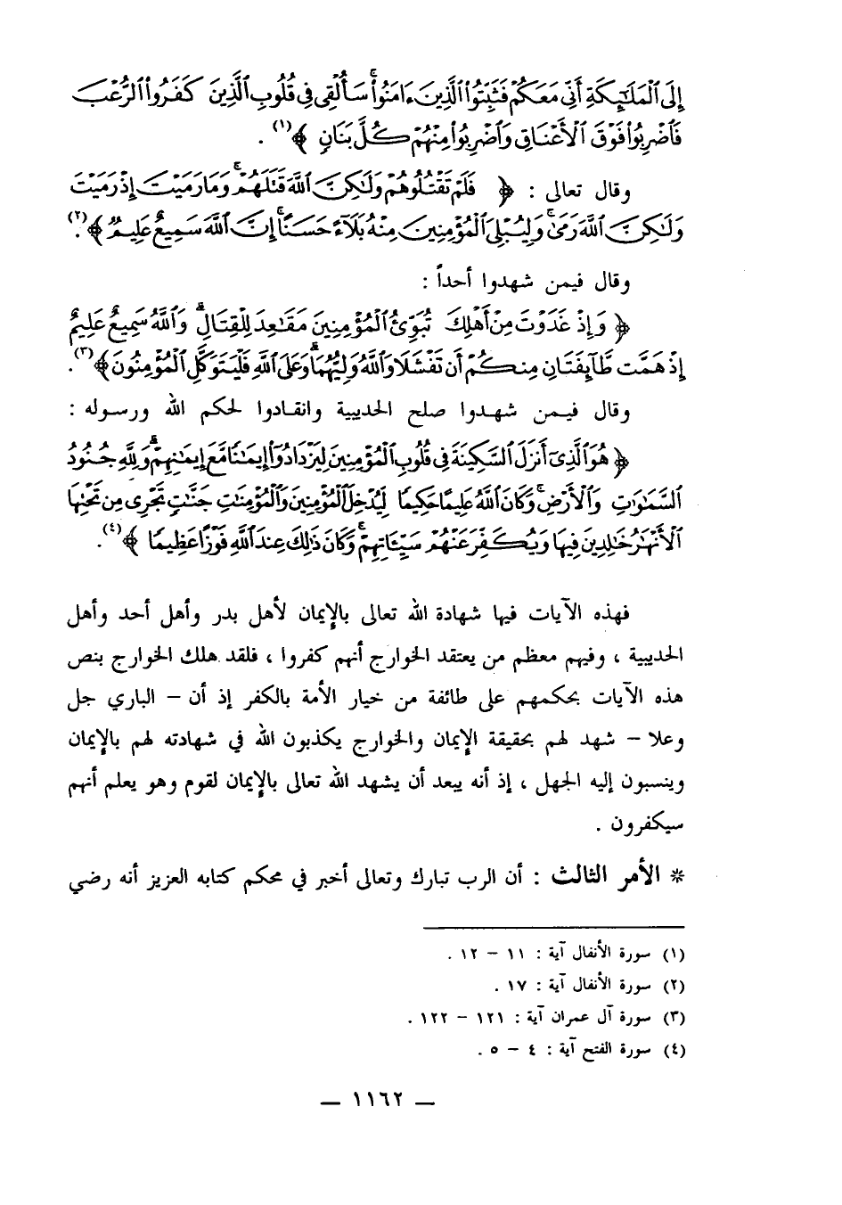 فهذه الآيات فيها شهادة الله تعالى بالإيمان لأهل بدر وأهل أحد وأهل الحديبية، وفيهم معظم من يعتقد الخوارج أنهم كفروا، فلقد هلك الخوارج بنص هذه الآيات بحكمهم على طائفة من خيار الأمة بالكفر إذ أن ـ الباري جل وعلا ـ شهد لهم بحقيقة الإيمان والخوارج يكذبون الله في شهادته لهم بالإيمان ويسنبون إليه الجهل، إذ أنه يبعد أن يشهد الله تعالى بالإيمان لقوم وهو يعلم أنه سيكفرون.