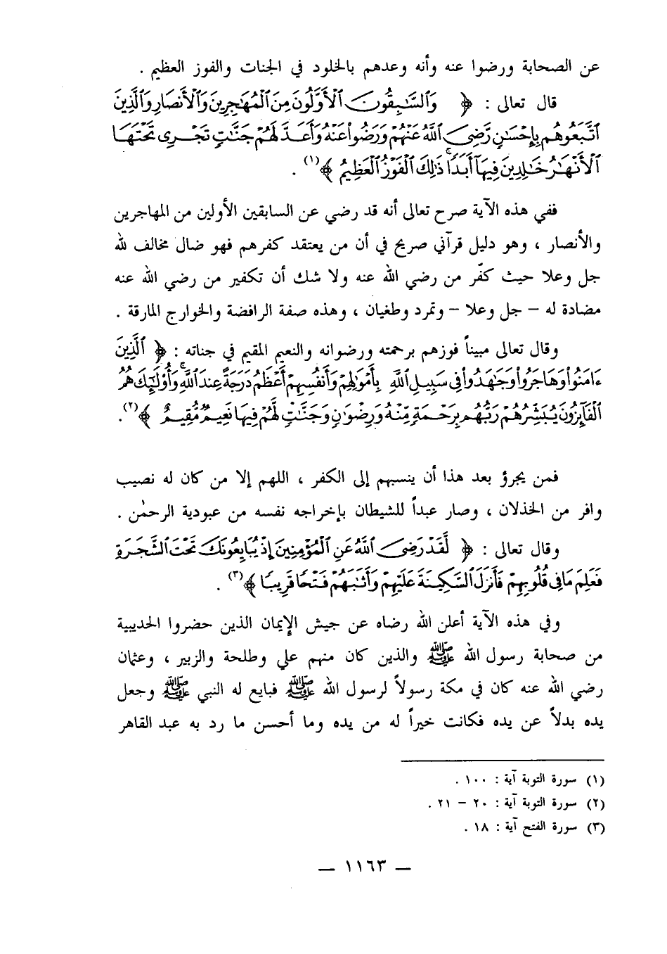 فمن يجرؤ بعد هذا أن ينسبهم إلى الكفر، اللهم إلا من كان له نصيب وافر من الخذلان، وصار عبداً للشيطان بإخراجه نفسه من عبودية الرحمن. وقال تعالى: {لَقَدْ رَضِيَ اللَّهُ عَنِ الْمُؤْمِنِينَ إِذْ يُبَايِعُونَكَ تَحْتَ الشَّجَرَةِ فَعَلِمَ مَا فِي قُلُوبِهِمْ فَأَنْزَلَ السَّكِينَةَ عَلَيْهِمْ وَأَثَابَهُمْ فَتْحاً قَرِيباً} 3.
