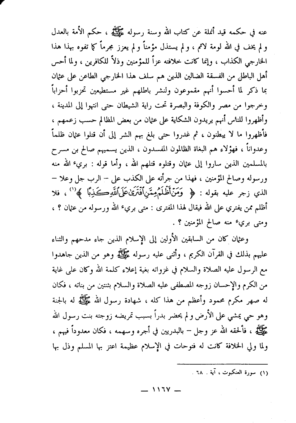 عنه في حكمه قيد أنملة عن كتاب الله وسنة رسوله صلى الله عليه وسلم، حكم الأمة بالعدل ولم يخف في الله لومة لائم، ولم يستذل مؤمناً ولم يعزز مجرماً كا تفوه بهذا هذا الخارجي الكذاب، وإنما كانت خلافته عزاً للمؤمنين وذلاً للكافرين، ولما أحس أهل الباطل من الفسقة الضالين الذين هم سلف هذا الخارجي لطاعن على عثمان بما ذكر لما أحسوا أنهم مقموعون ولنشر باطلهم غير مستعطيعين تحزبوا أحزاباً وخرجوا من مصر والكوفة والبصرة تحت راية الشيطان حتى انتهوا إلى المدينة، وأظهروا للناس أنهم يريدون الشكاية على عثمان من بعض المظالم حسب زعمهم، فأظهروا ما لا يبطنون، ثم غدروا حتى بلغ بهم الشر إلى أن قتلوا عثمان ظلماً وعدواناً، فهؤلاء هم البغاة الظالمون المفسدون، الذين يسميهم صالح بن مسرح بالمسلمين الذين ساروا إلى عثمان وقتلوه قتلهم الله، وأما قوله: بريء الله منه ورسوله وصالح المؤمنين، فهذا من جرأته على الكذب على ـ الرب جل وعلا ـ الذي زجر عليه بقوله: {وَمَنْ أَظْلَمُ مِمَّنِ افْتَرَى عَلَى اللَّهِ كَذِباً} 1، فلا أظلم ممن يفتري على الله فيقال لهذا المفترى: متى بريء الله ورسوله من عثمان؟، ومتى بريء منه صالح المؤمنين؟.