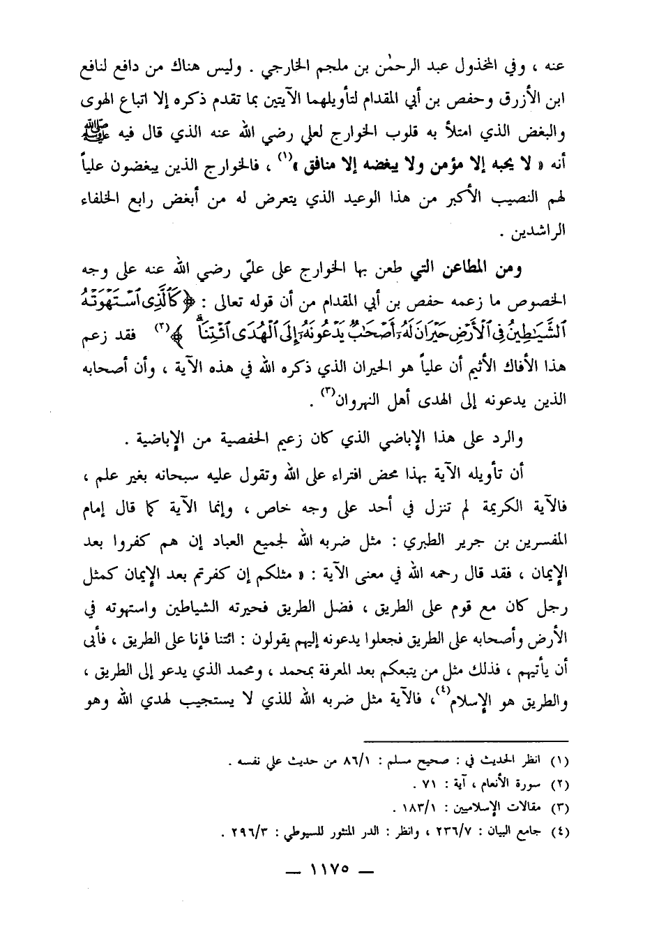 ومن المطاعن التي طعن بها الخوارج على علي رضي الله عنه على وجه الخصوص ما زعمه حفص بن أبي المقدام من أن قوله تعالى: {كَالَّذِي اسْتَهْوَتْهُ الشَّيَاطِينُ فِي الأَرْضِ حَيْرَانَ لَهُ أَصْحَابٌ يَدْعُونَهُ إِلَى الْهُدَى ائْتِنَا} 2 فقد زعم هذا الأفاك الأثيم أن علياً هو الحيران الذي ذكره الله في هذه الآية، وأن أصحابه الذين يدعونه إلى الهدى أهل النهروان3.
