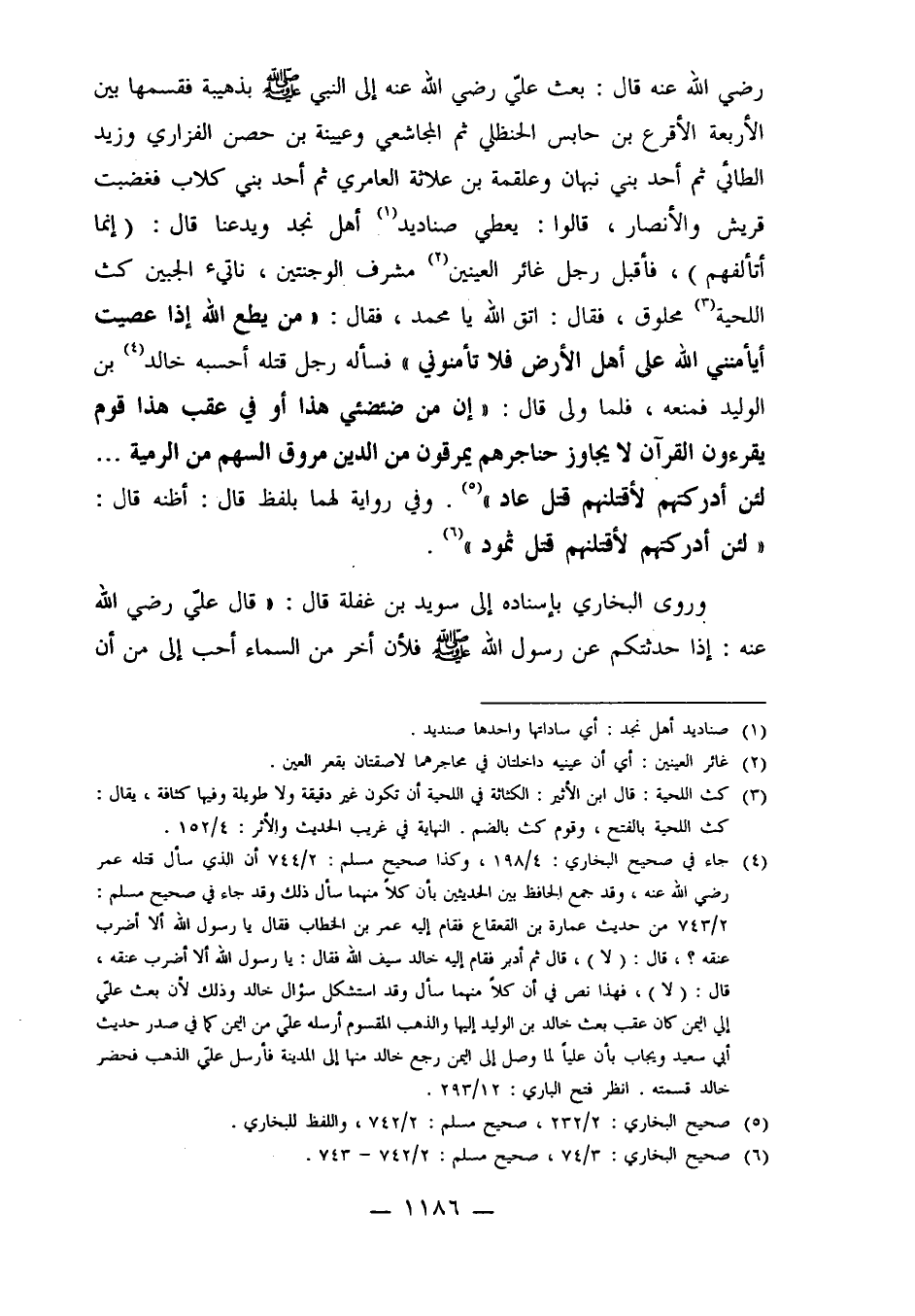رضي الله عنه قال: بعث علي رضي الله عنه إلى النبي صلى الله عليه وسلم بذهيبة فقسمها بين الأربعة الأقرع بن حابس الحنظلي ثم المجاشعي وعيينة بن حصن الفزاري وزيد الطائي ثم أحد بني نبهان وعلقمة بن علاثة العامري ثم أحد بني كلاب فغضبت قريش والأنصار، قالوا: يعطي صناديد1 أهل نجد ويدعنا قال: "إنما أتألفهم"، فأقبل رجل غائر العينين2 مشرف الوجنتين، ناتئ الجبين كث اللحية3 محلوق، فقال: اتق الله يا محمد، فقال: "من يطع الله إذا عصيت أيأمنني الله على أهل الأرض فلا تأمنوني" فسأله رجل قتله أحسبه خالد4 بن الوليد فمنعه، فلما ولى قال: "إن من ضئضئي هذا أو في عقب هذا قوم يقرءون القرآن لا يجاوز حناجرهم يمرقون من الدين مروق السهم من الرمية ... لئن أدركتهم لأقتلنهم قتل عاد "5.