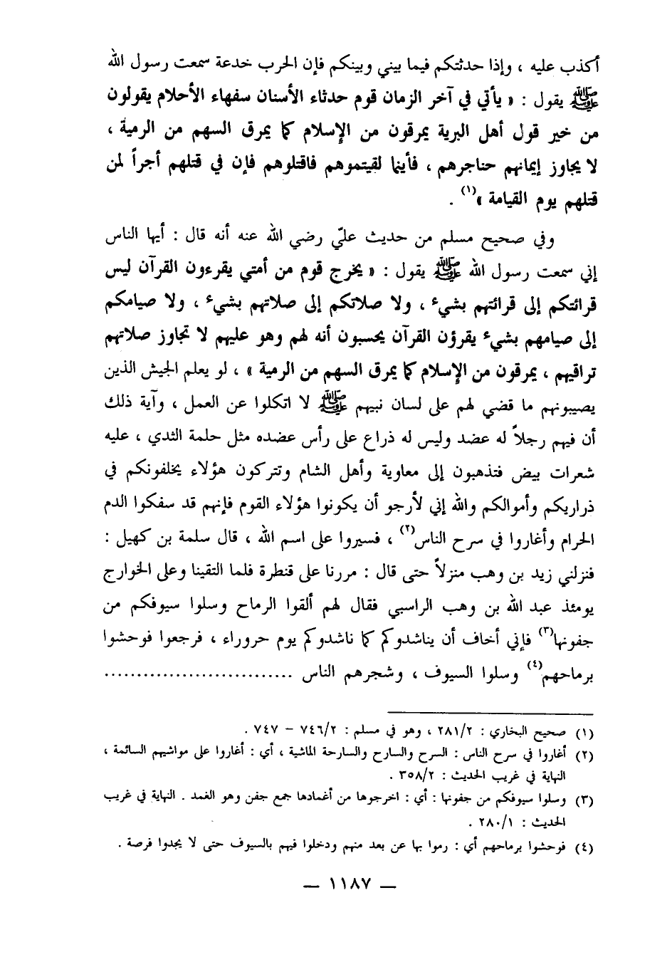 وفي صحيح مسلم من حديث علي رضي الله عنه أنه قال: أيها الناس إني سمعت رسول الله صلى الله عليه وسلم يقول: "يخرج قوم من أمتي يقرءون القرآن ليس قرائتكم إلى قرائتهم بشيء، ولا صلاتكم إلى صلاتهم بشيء، ولا صيامكم إلى صيامهم بشيء يقرءون القرآن يحسبون أنه لهم وهو عليهم لا تجاوز صلاتهم تراقيهم، يمرقون من الإسلام كما يمرق السهم من الرمية"، لو يعلم الجيش الذين يصيبونهم ما قضى لهم على لسان نبيهم صلى الله عليه وسلم لاتكلوا عن العمل وآية ذلك أن فيهم رجلاً له عضد وليس له ذراع على رأس عضده مثل حلمة الثدي، عليه شعرات بيض فتذهبون إلى معاوية وأهل الشام وتتركون هؤلاء يخلفونكم في ذراريكم وأموالكم والله إني لأرجو أن يكون هؤلاء القوم فإنهم قد سفكوا الدم الحرام وأغاروا في سرح الناس2، فسيروا على اسم الله، قال سلمة بن كهيل: فنزلني زيد بن وهب منزلاً حتى قال: مررنا على قنطرة فلما التقينا وعلى الخوارج يومئذ عبد الله بن وهب الراسبي فقال لهم ألقوا الرماح وسلوا سيوفكم من جفونها 3 فإني أخاف أن يناشدوكم كما ناشدوكم يوم حروراء، فرجعوا فوحشوا برماحهم4 وسلوا السيوف، وشجرهم الناس.....