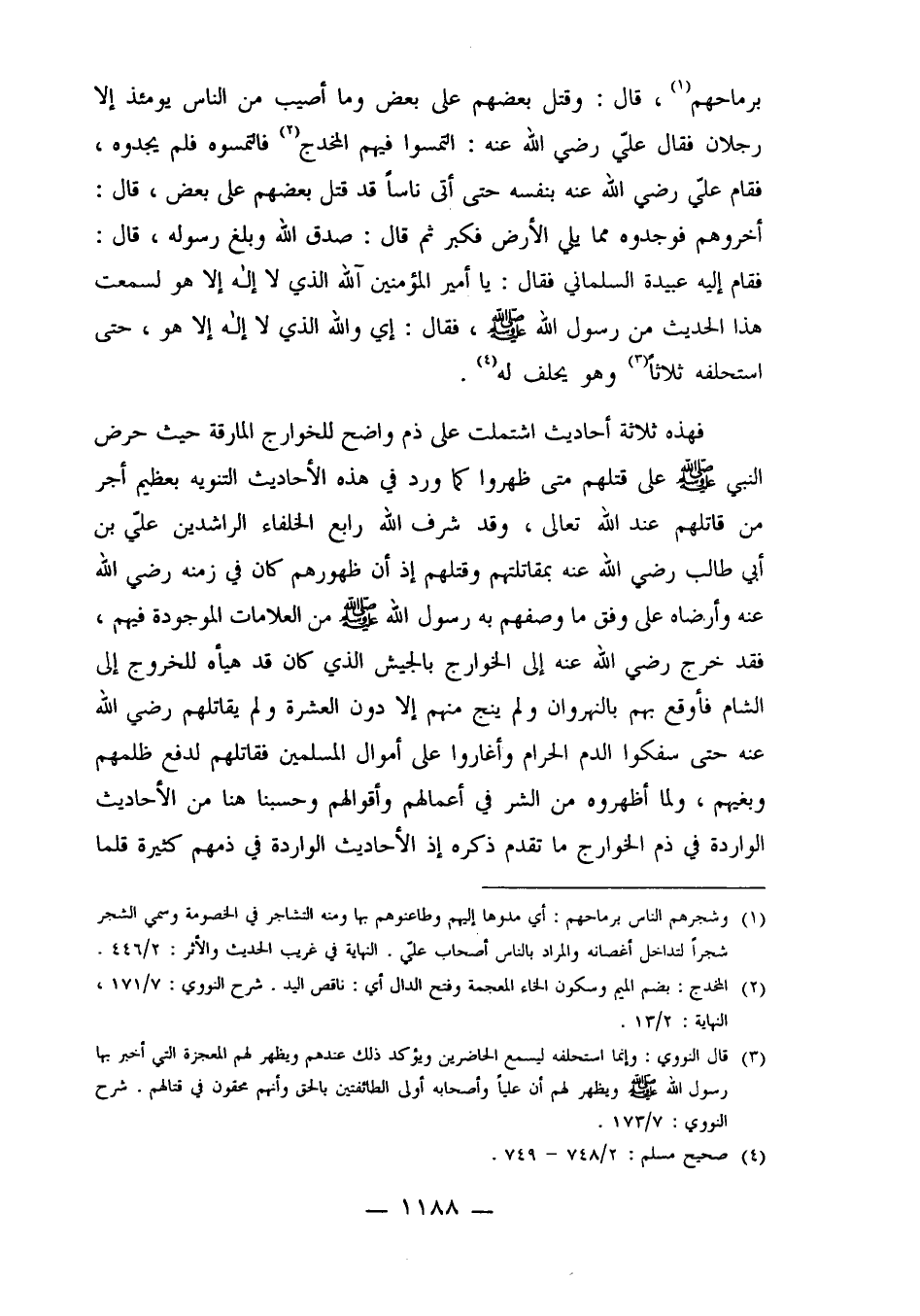فهذه ثلاثة أحاديث اشتملت على ذم واضح للخوارج المارقة حيث حرض النبي صلى الله عليه وسلم على قتلهم متى ظهروا كما ورد في هذه الأحاديث التنويه بعظيم أجر من قاتلهم عند الله تعالى، وقد شرف الله رابع الخلفاء الراشدين علي بن أبي طالب رضي الله عنه بمقاتلتهم وقتلهم إذ أن ظهروهم كان في زمنه رضي الله عنه وأرضاه على وفق ما وصفهم به رسول الله صلى الله عليه وسلم من العلامات الموجودة فيهم، فقد خرج رضي الله عنه إلى الخوارج بالجيش الذي كان قد هيأه للخروج إلى الشام فأوقع بهم بالنهروان ولم ينج منهم إلا دون العشرة ولم يقاتلهم رضي الله عنه حتى سفكوا الدم الحرام وأغاروا على أموال المسلمين فقاتلهم لدفع ظلمهم وبغيهم، ولما أظهروه من الشر في أعمالهم وأقوالهم وحسبنا هنا من الأحاديث الواردة في ذم الخوراج ما تقدم ذكره إذ الأحاديث الورادة في ذمهم كثيرة قلما