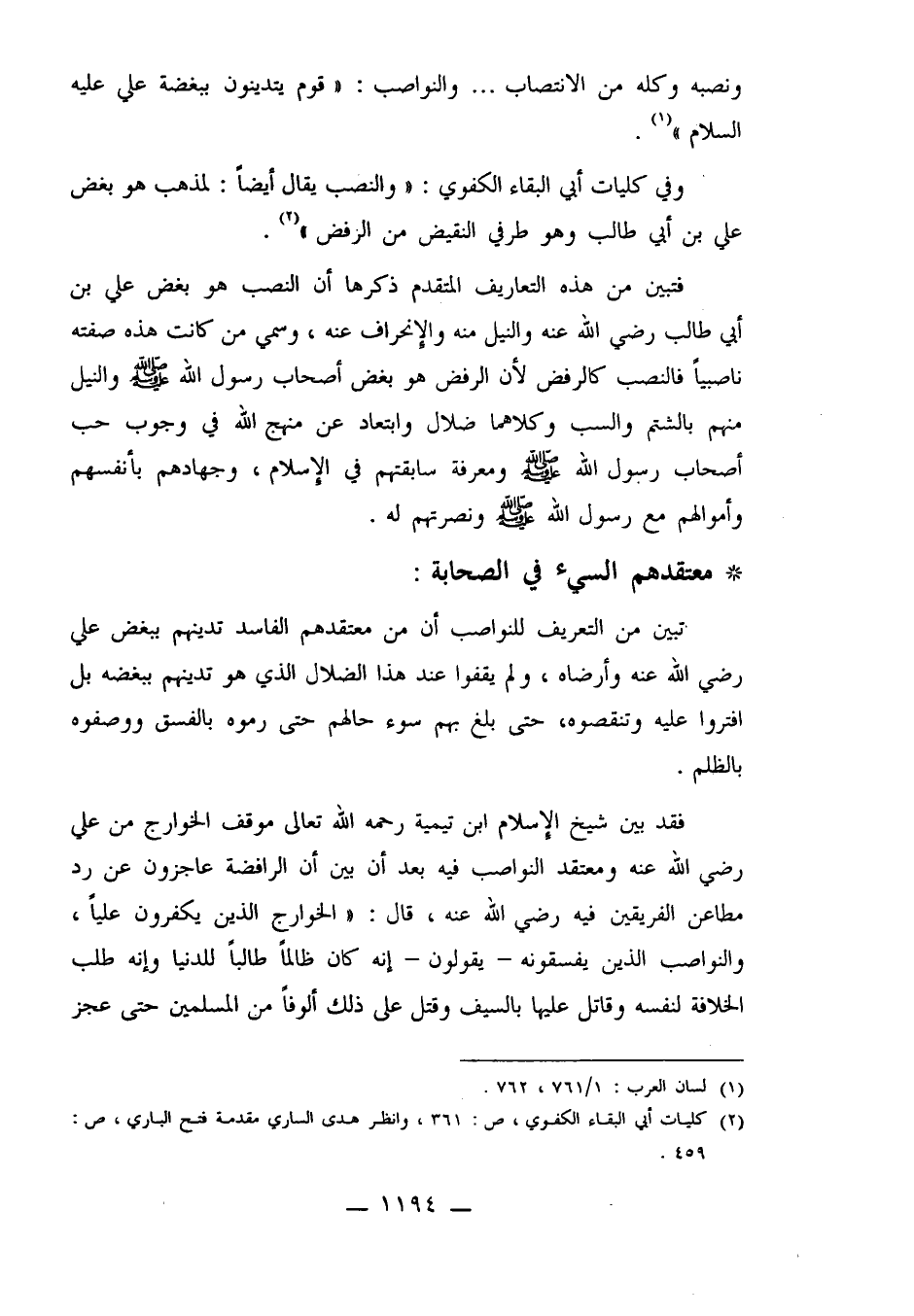 وفي كليات أبي البقاء الكفوي: "والنصب يقال أيضاً: لمذهب هو بغض علي بن أبي طالب وهو طرفي النقيض من الرفض"2.