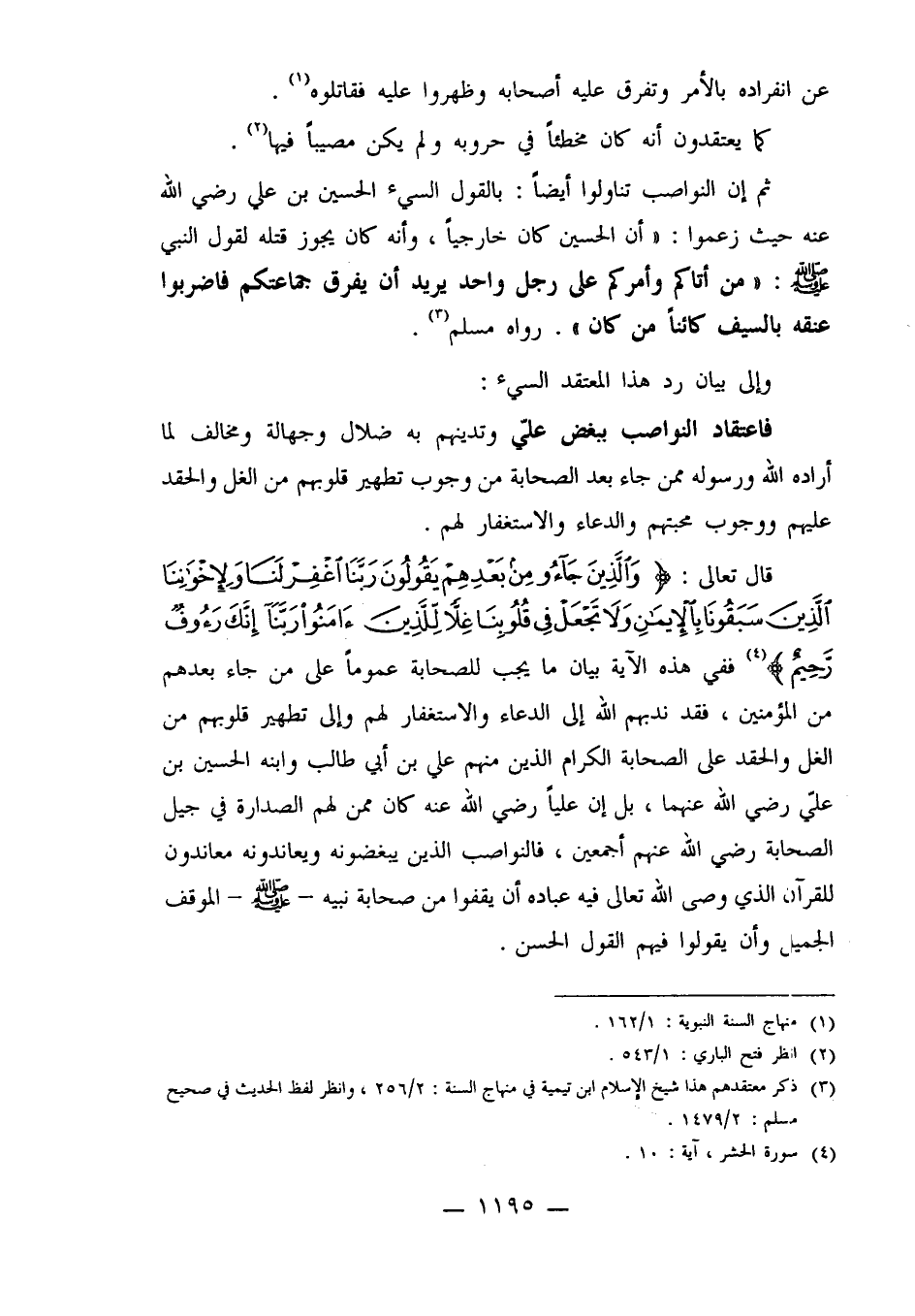 قال تعالى: {وَالَّذِينَ جَاءُوا مِنْ بَعْدِهِمْ يَقُولُونَ رَبَّنَا اغْفِرْ لَنَا وَلإِخْوَانِنَا الَّذِينَ سَبَقُونَا بِالأِيمَانِ وَلا تَجْعَلْ فِي قُلُوبِنَا غِلاًّ لِلَّذِينَ آمَنُوا رَبَّنَا إِنَّكَ رَؤُوفٌ رَحِيمٌ} 4 ففي هذه الآية بيان ما يجب للصحابة عموماً على من جاء بعدهم من المؤمنين، فقد ندبهم الله إلى الدعاء والاستغفار لهم وإلى تطهير قلوبهم من الغل والحقد على الصحابة الكرام الذين منهم علي بن أبي طالب وابنه الحسين بن علي رضي الله عنهما، بل إن علياً رضي الله عنه كان ممن لهم الصدارة في جيل الصحابة رضي الله عنهم أجمعين، فالنواصب الذين يبغضونه ويعاندونه معاندون للقرآن الذي وصى الله تعالى فيه عباده أن يقفوا من صحابة نبيه صلى الله عليه وسلم الموقف الجميل وأن يقولوا فيهم القول الحسن.