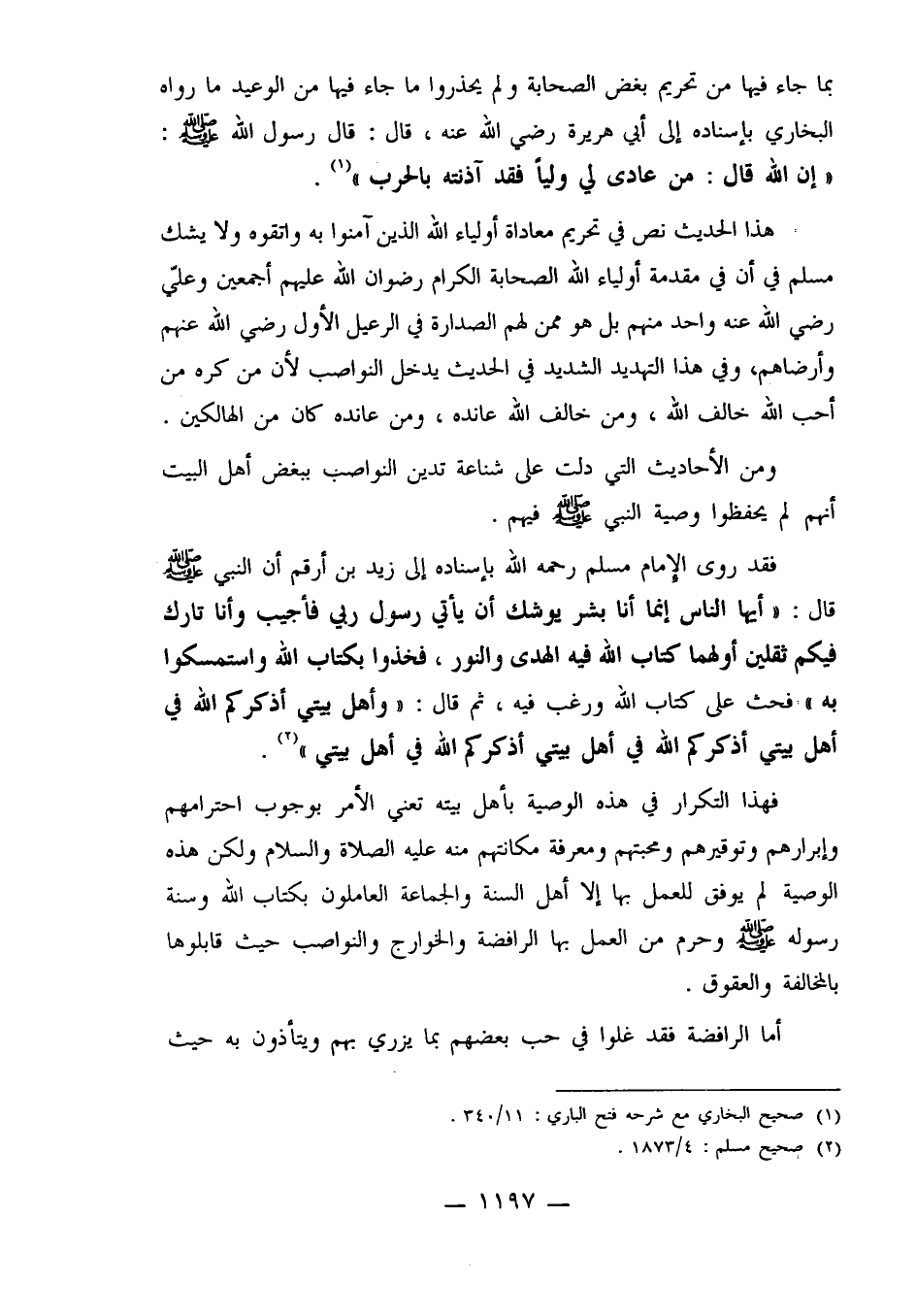 بما جاء فيها من تحريم بغض الصحابة ولم يحذروا ما جاء فيها من الوعيد ما رواه البخاري بإسناده إلى أبي هريرة رضي الله عنه، قال: قال رسول الله صلى الله عليه وسلم: "إن الله قال: من عادى لي ولياً فقد آذنته بالحرب" 1.