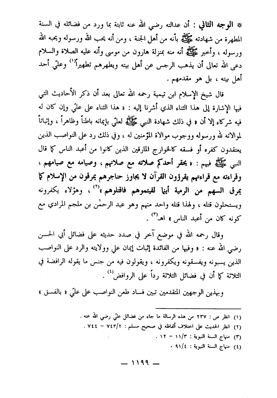 وقال رحمه الله في موضع آخر في صدد حديثه على فضائل أبي الحسن رضي الله عنه: "وفيها من الفائدة إثبات إيمان علي وولايته والرد على النواصب الذين يسبونه ويفسقونه ويكفرونه، ويقولون فيه من جنس ما يقوله الرافضة في الثلاثة كما أن في فضائل الثلاثة رداً على الروافض4.