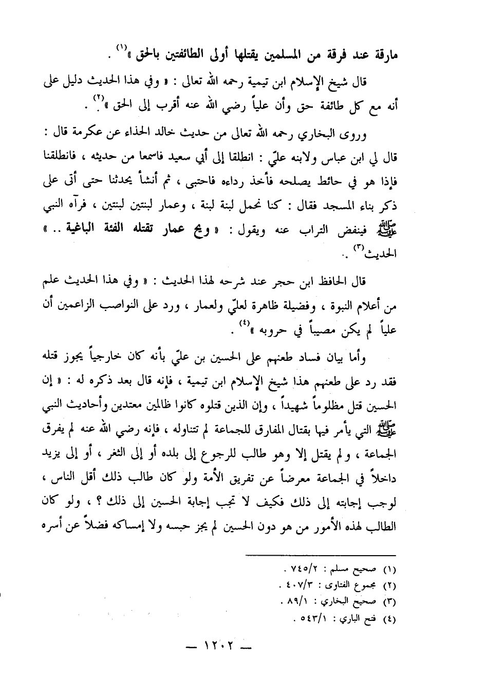 قال شيخ الإسلام ابن تيمية رحمه الله تعالى: "وفي هذا الحديث دليل على أنه مع كل طائفة حق وأن علياً رضي الله عنه أقرب إلى الحق"2.