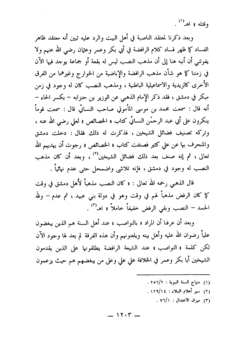 وبعد ذكرنا لمعتقد الناصبة في أهل البيت والرد عليه تبين أنه معتقد ظاهر الفساد كما ظهر فساد كلام الرافضة في أبي بكر وعمر وعثمان رضي الله عنهم ولا يفوتني أن أنبه هنا إلى أن مذهب النصب ليس له بقعة أو جماعة يوجد فيها الآن في زماننا كما هو شأن مذهب الرافضة والإباضية من الخوراج وغيرهما من الفرق الأخرى كالزيدية والإسماعلية الباطنية، ومذهب النصب كان له وجود في زمن مبكر في دمشق، فقد ذكر الإمام الذهبي عن الوزير بن حنزابه ـ بكسر الحاء ـ أنه قال: سمعت محمد بن موسى المأموني صاحب النسائي قال: سمعت قوماً ينكرون على أبي عبد الرحمن النسائي كتاب "الخصائص" لعلي رضي الله عنه، وتركه تصنيف فضائل الشيخين، فذكرت له ذلك فقال: دخلت دمشق والمنحرف بها عن علي كثير فصنفت كتاب "الخصائص" رجوت أن يهديهم الله تعالى، ثم إنه صنف بعد ذلك فضائل الشيخين2، وبعد أن كان مذهب النصب له وجود في دمشق، فإنه تلاشى واضمحل حتى عدم نهائياً.