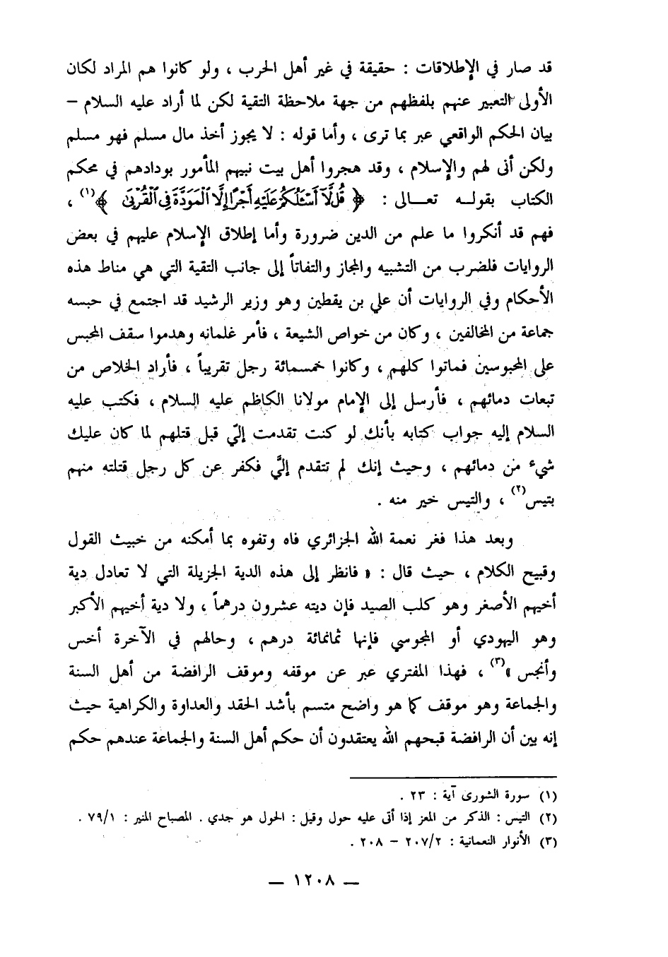 وبعد هذا فغر نعمة الله الجزائري فاه وتفوه بما أمكنه من خبيث القول وقبيح الكلام، حيث قال: "فانظر إلى هذه الدية الجزيلة التي لا تعادل دية أخيهم الأصغر وهو كلب الصيد فإن ديته عشرون درهماً، ولا دية أخيهم الأكبر وهو اليهودي أو المجوسي فإنها ثمانمائة درهم، وحالهم في الآخرة أخس وأنجس"3، فهذا المفتري عبر عن موقفه وموقف الرافضة من أهل السنة والجماعة وهو موقف كما هو واضح متسم بأشد الحقد والعداوة والكراهية حيث إنه بين أن الرافضة قبحهم الله يعتقدون أن حكم أهل السنة والجماعة عندهم حكم